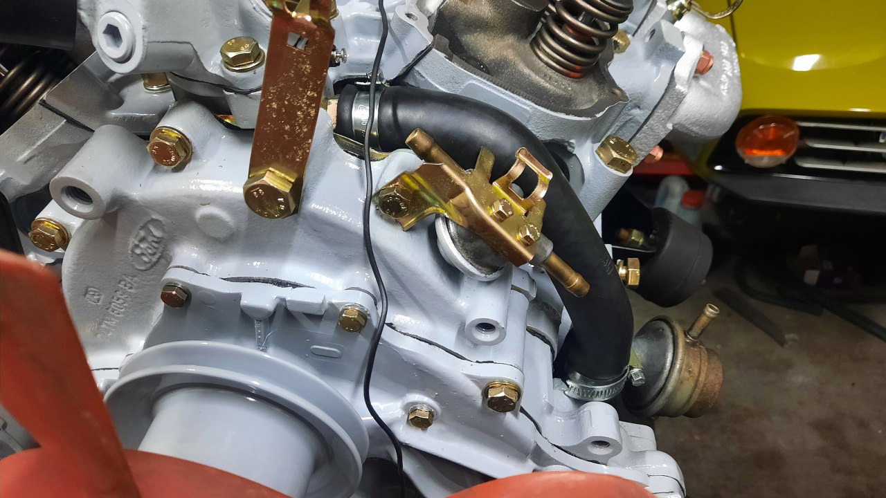 Z przodu, do pokrywy rozrządu, przykręciłem podstawkę pod przewód chłodzenia (po lewej) i regulator ciśnienia paliwa.