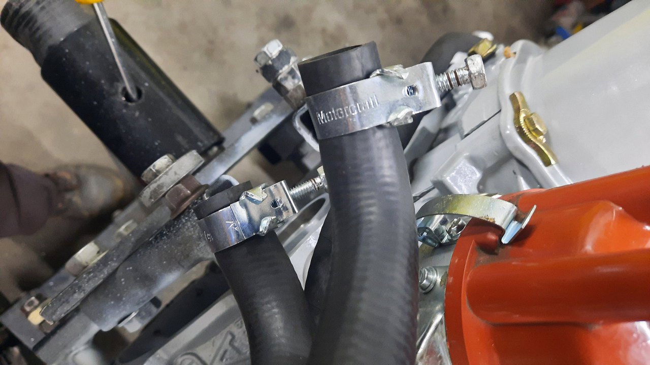 Rurki prowadzą na tył silnika, w tej okolicy podłączone są do nagrzewnicy. Widać też, przy okazji, przykręcone mocowanie linki gazu.