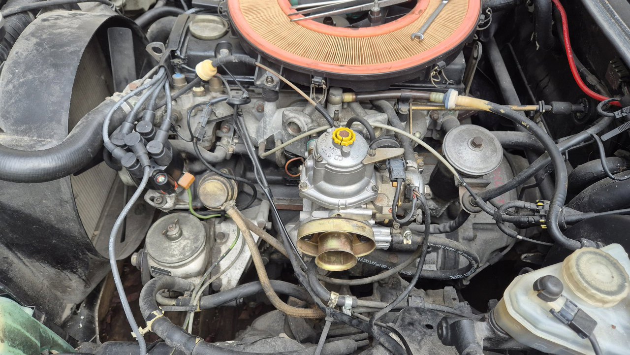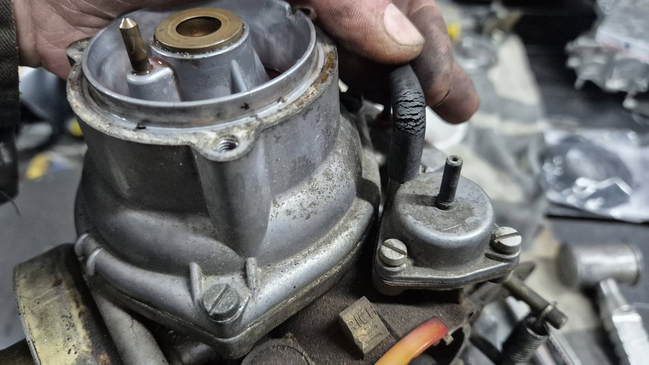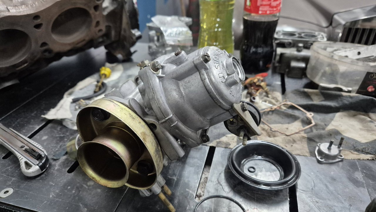 Najpierw zdjąłem rurę dolotową i zacząłem odpinać rurki i kabelki. Sam gaźnik to Stromberg 175CD. Widać, że jest zapyziały. Zwłaszcza komora pływakowa, tu niewidoczna, ale będąca na samym dole gaźnika, jest mocno upaprana.