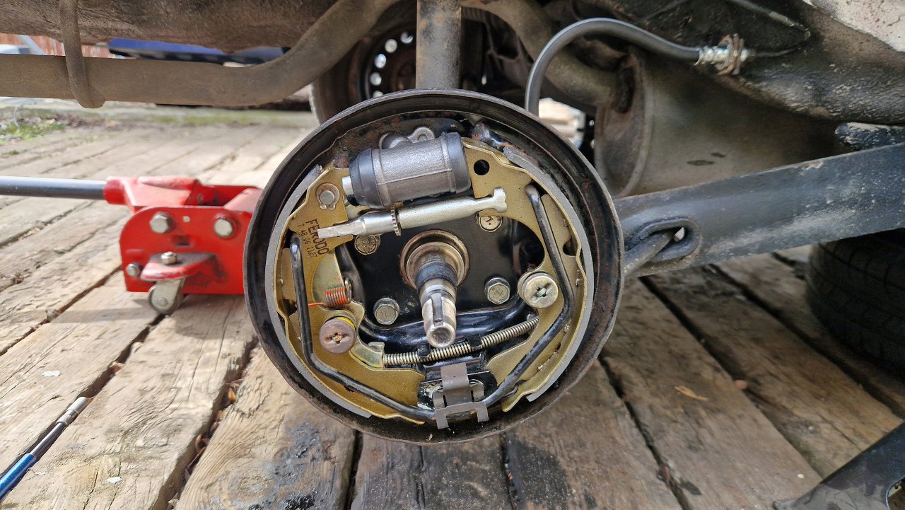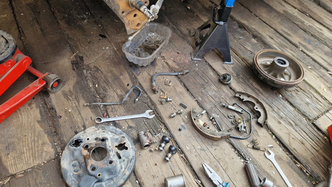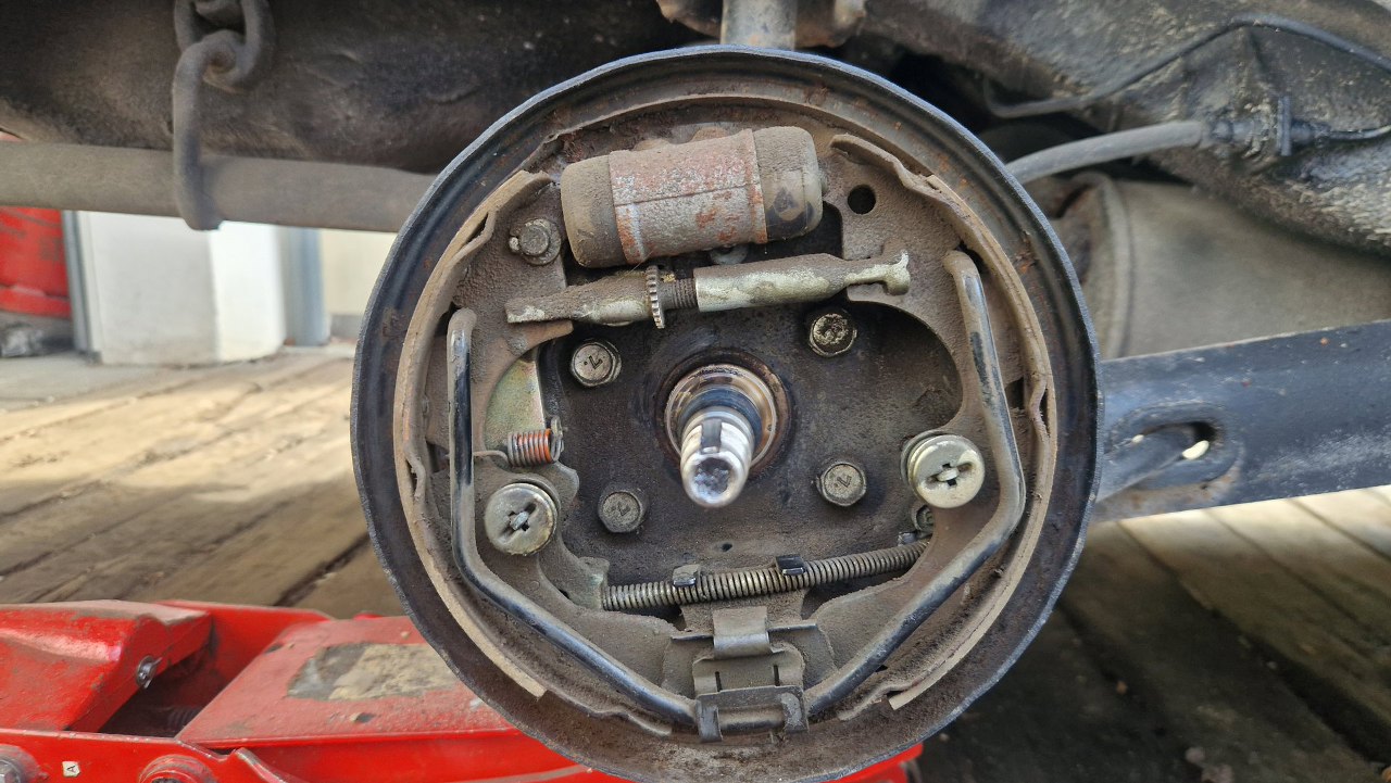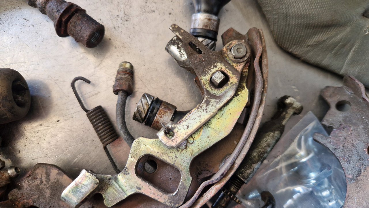 Zostaje tarcza kotwiczna. Dość zapyziała i pełna pyłu ze szczęk. Nie chce mi się tego tu czyścić, a tym bardziej dmuchać tu sprężarką, więc to wszystko zdejmę. I tak muszę rozpiąć hamulce, żeby wymienić rurki gumowe i zmienić płyn w układzie.