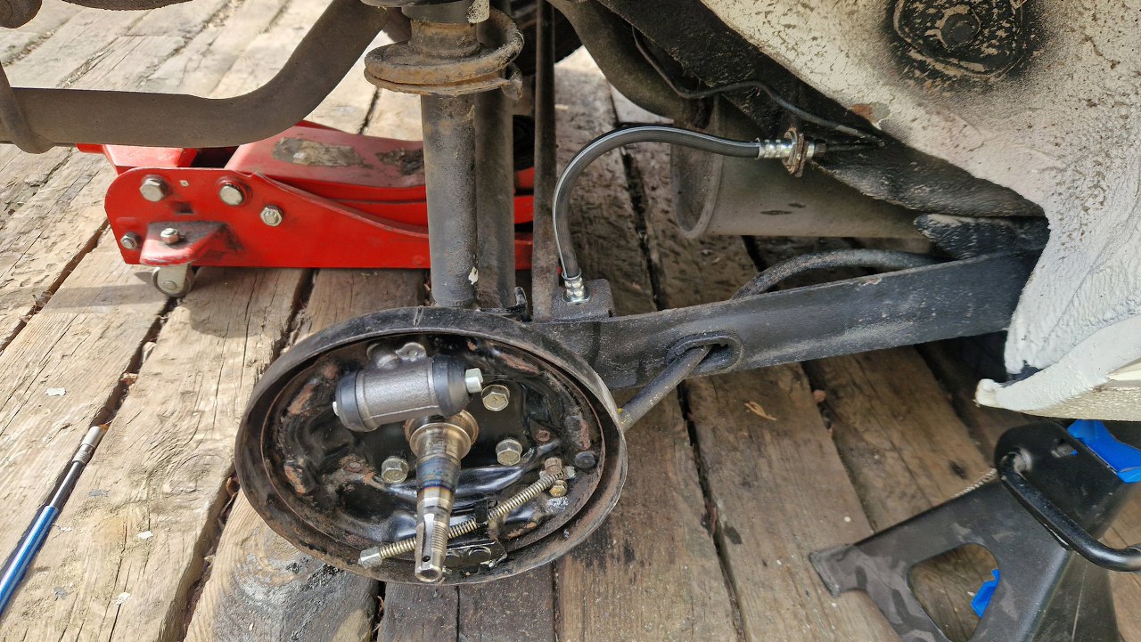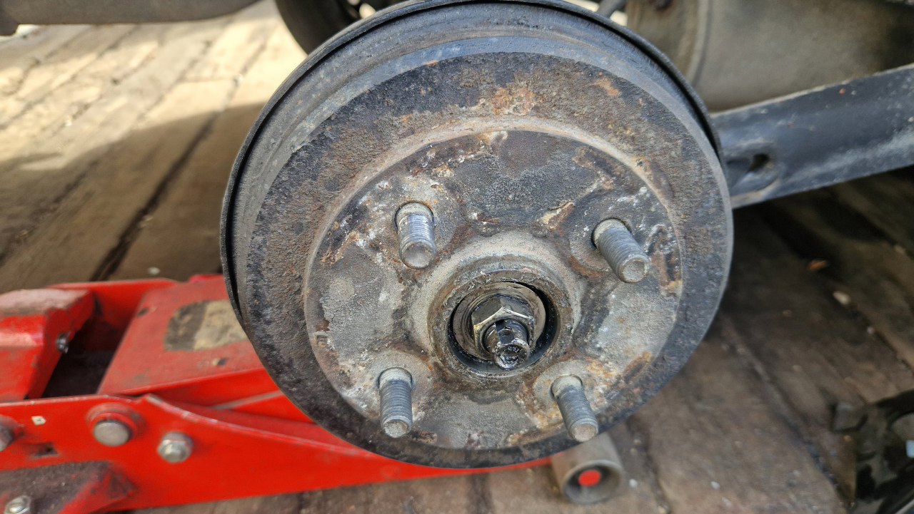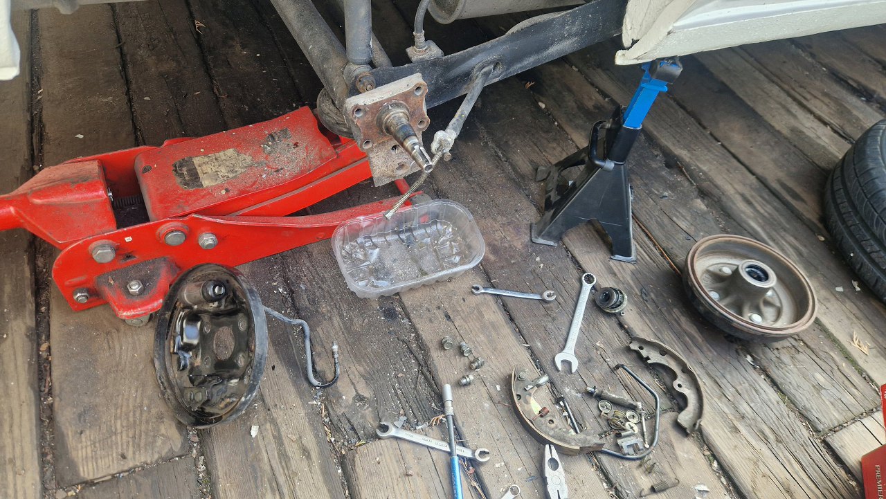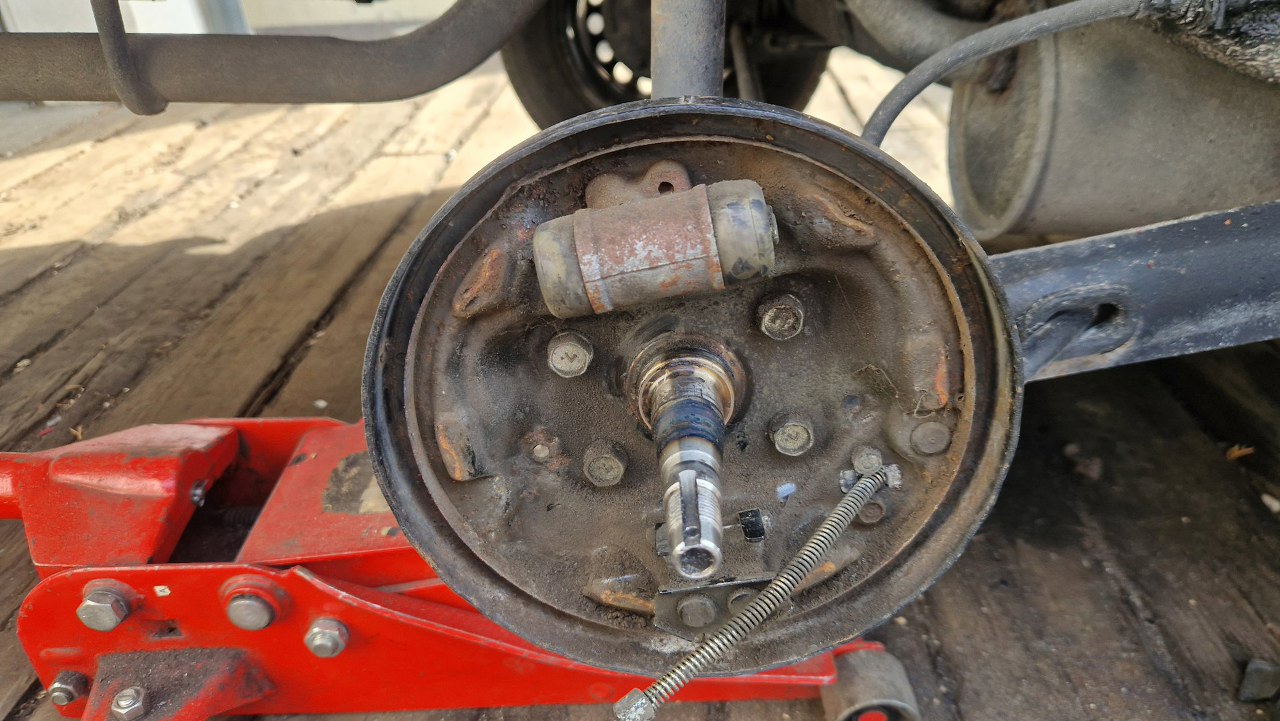 Zostaje tarcza kotwiczna. Dość zapyziała i pełna pyłu ze szczęk. Nie chce mi się tego tu czyścić, a tym bardziej dmuchać tu sprężarką, więc to wszystko zdejmę. I tak muszę rozpiąć hamulce, żeby wymienić rurki gumowe i zmienić płyn w układzie.
