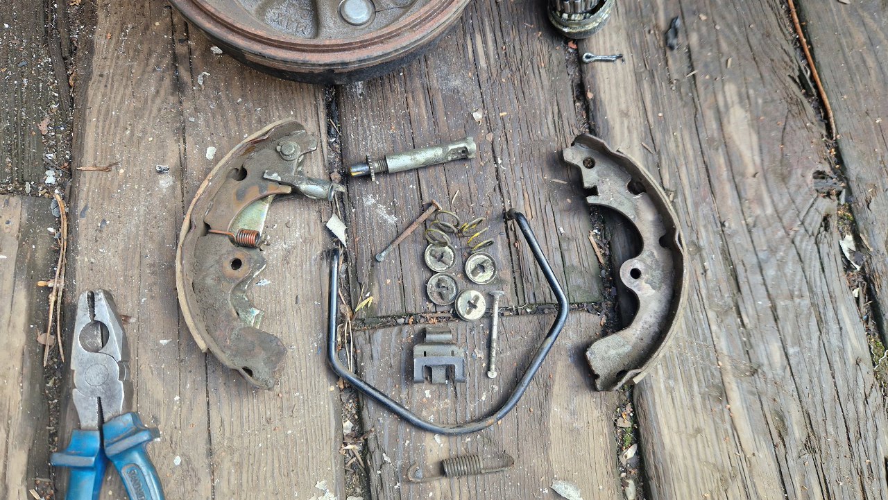 Po zdjęciu piastobębna widać hamulce. Szczęki zużyte prawie do końca, natomiast moją uwagę zwraca nietypowa sprężyna napinająca szczęki - to ten pręt w kształcie U, czy V.