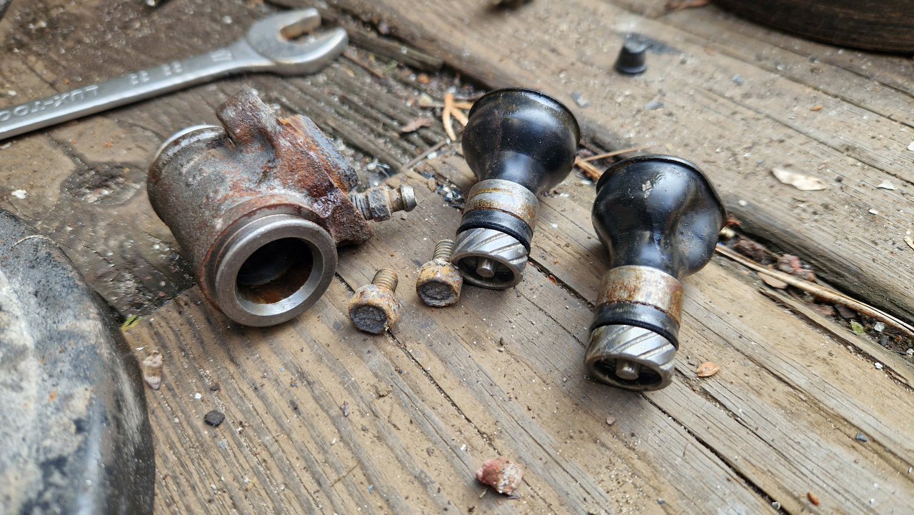 Cylinderek jeszcze przed demontażem siknął mi płynem w momencie, kiedy nie powinien, więc zajrzałem do środka. No tak, trochę korozji, bo długo stał. Nie ma sensu tego polerować, bo może ciut tędy puszczać płyn. Wymienię i to.
