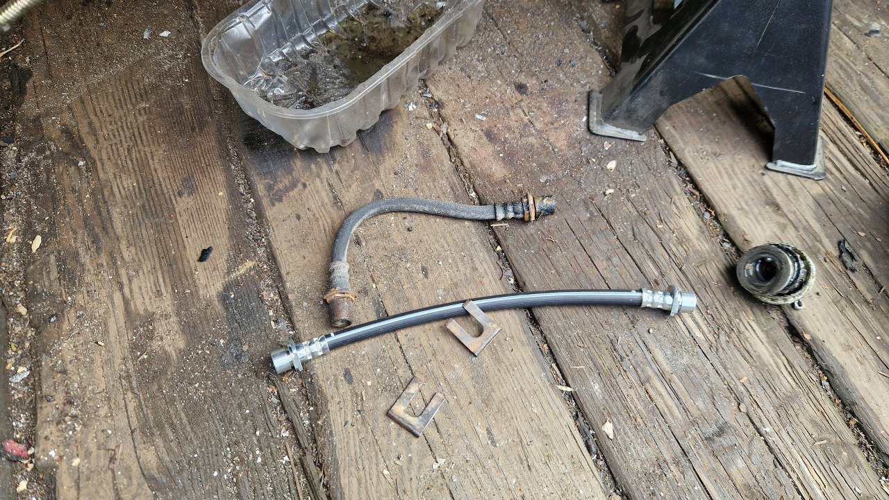 Jedną z nielicznych części, której nie mogłem znaleźć w katalogach, były te rurki hamulcowe. Dobrałem je ze Starleta nowszej generacji. Są dłuższe o kilka centymetrów i mają na końcu inny kształt niż te oryginalne rurki, więc musiałem lekko przypiłować otwory, w które wchodzą w karoserii.