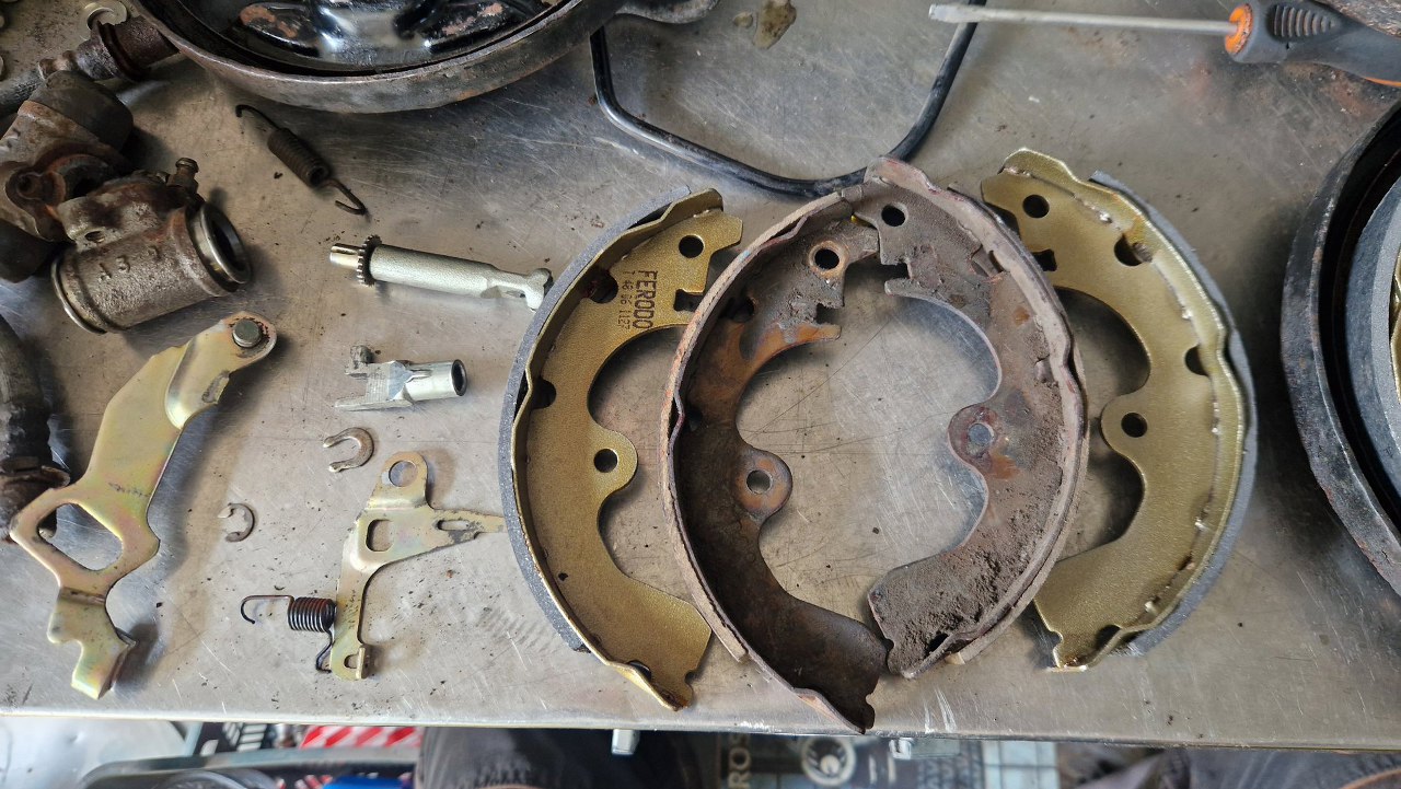 Ze starych szczęk trzeba przełożyć ramię hamulca ręcznego. To dość skomplikowany mechanizm.