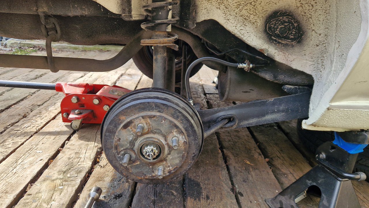 Potem przykręciłem tarcze kotwiczne do belki zawieszenia. Widać obok nowe rurki hamulcowe.