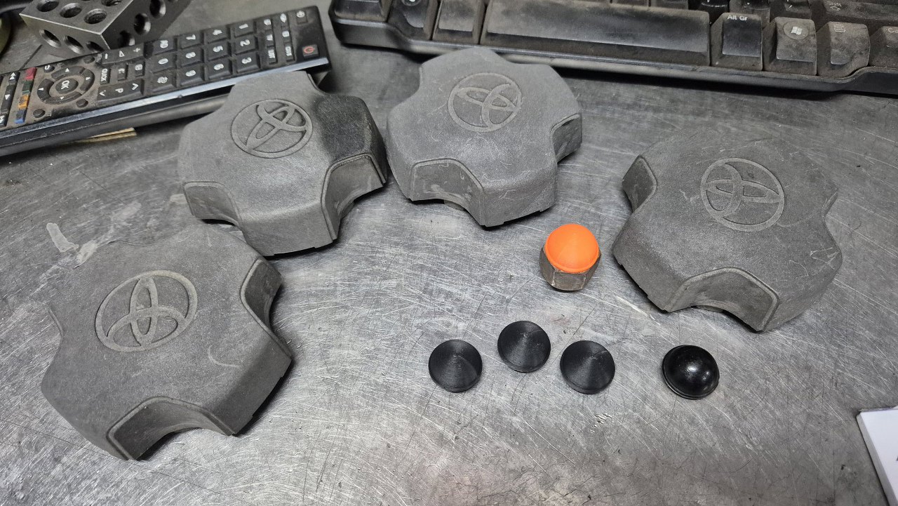 A tu już wydrukowane trzy brakujące zaślepki. Kołpaczki na piasty są prawie że niezdobywalne. Ja marudziłem jakiejś stacji demontażu pojazdów, która na OLX miała zdjęcie nowszego starleta z takimi kołpaczkami w ogłoszeniu z silnikiem, przez jakieś 7 miesięcy, aż mi je ściągnęli z auta i wysłali.