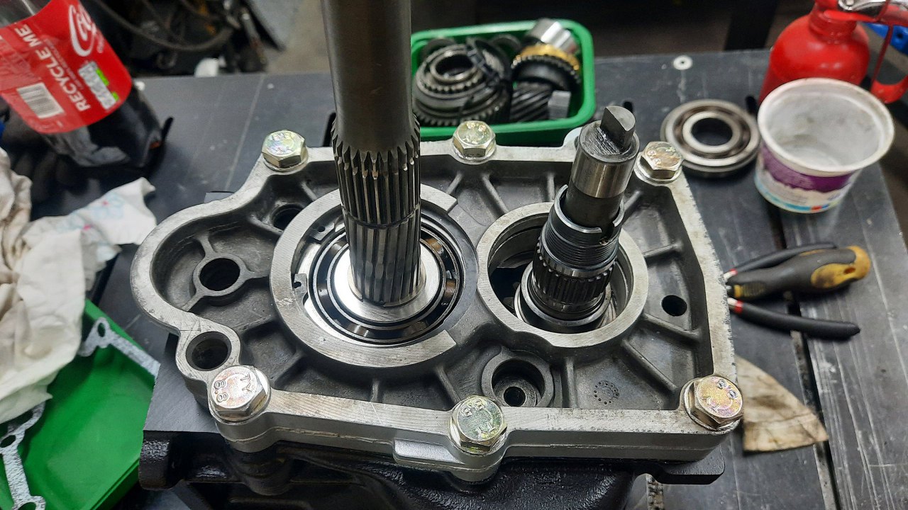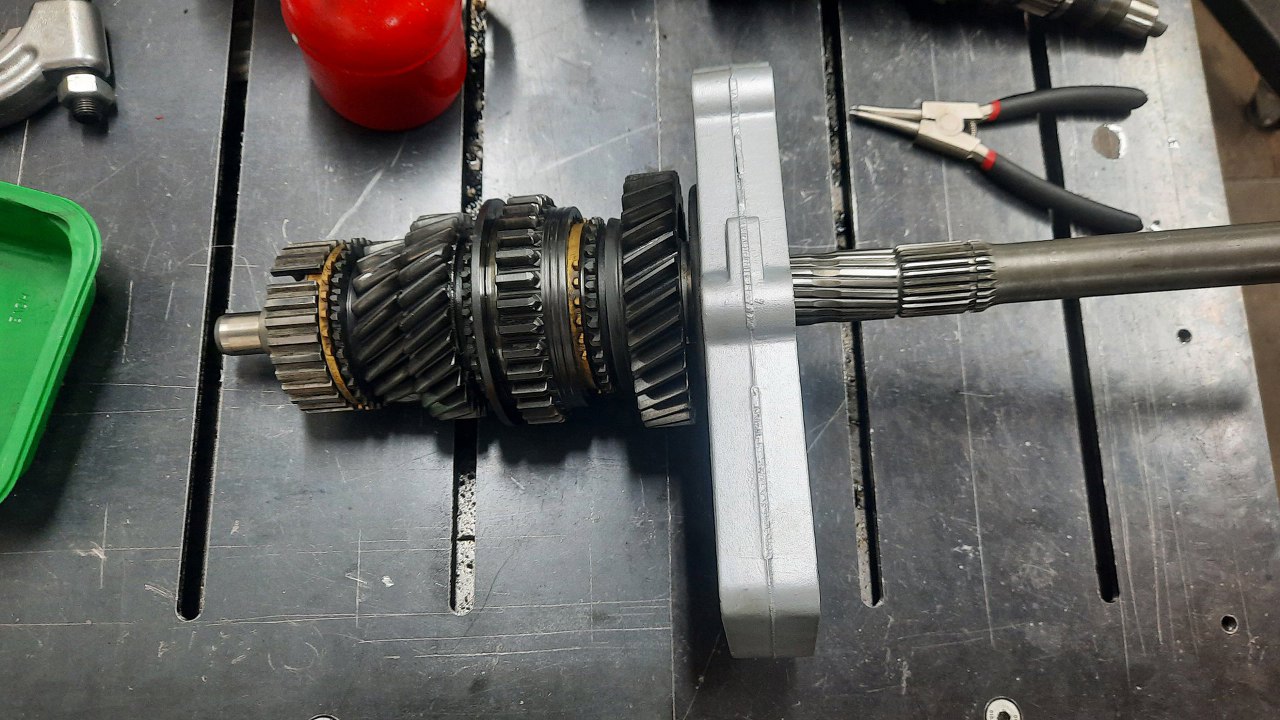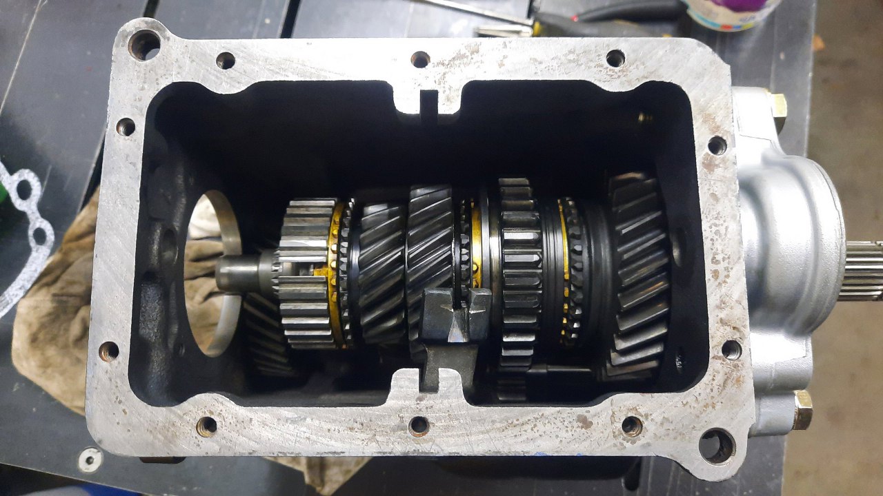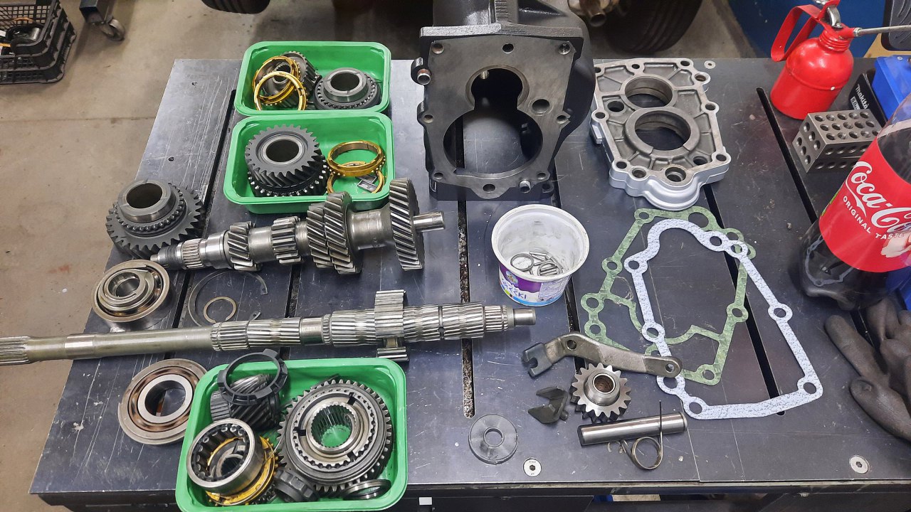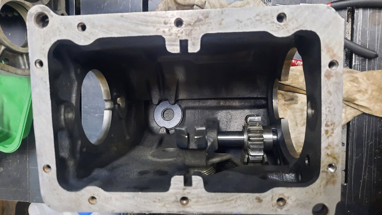 Po paru godzinach żmudnego mycia mam już wszystkie części skrzyni czyste, przejrzane i gotowe do składania. Z obudowy skrzyni wyjąłem jeszcze kółko wstecznego biegu z jego przesuwką. Wstępnie wszystko przejrzałem i nie zobaczyłem żadnych problemów - podejrzewam, że kłopoty z biegami spowodowane były głównie dużą ilością szlamu olejowego, któy sklejał wszystko zamiast smarować. Obudowę skrzyni mam też już domytą i pomalowaną, a śrubki się jeszcze cynkują. Zaczynam jednak to już składać, tym razem bardzo dokładnie weryfikując części.