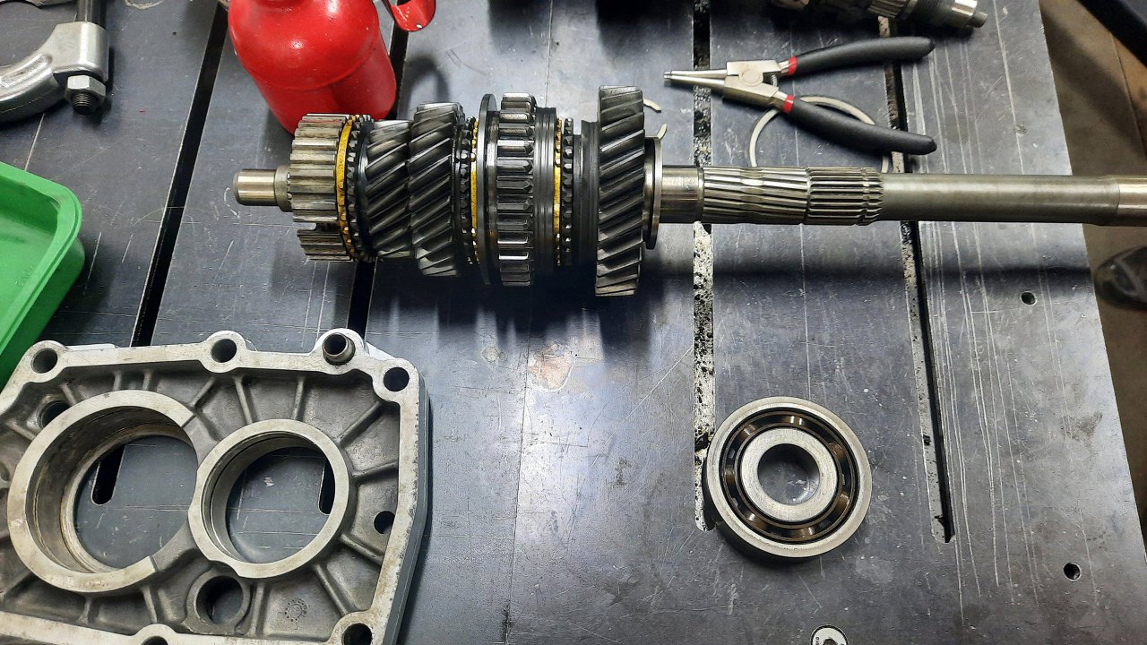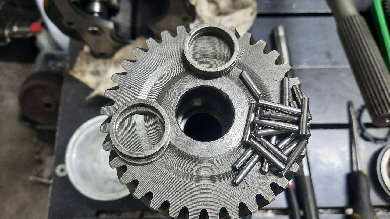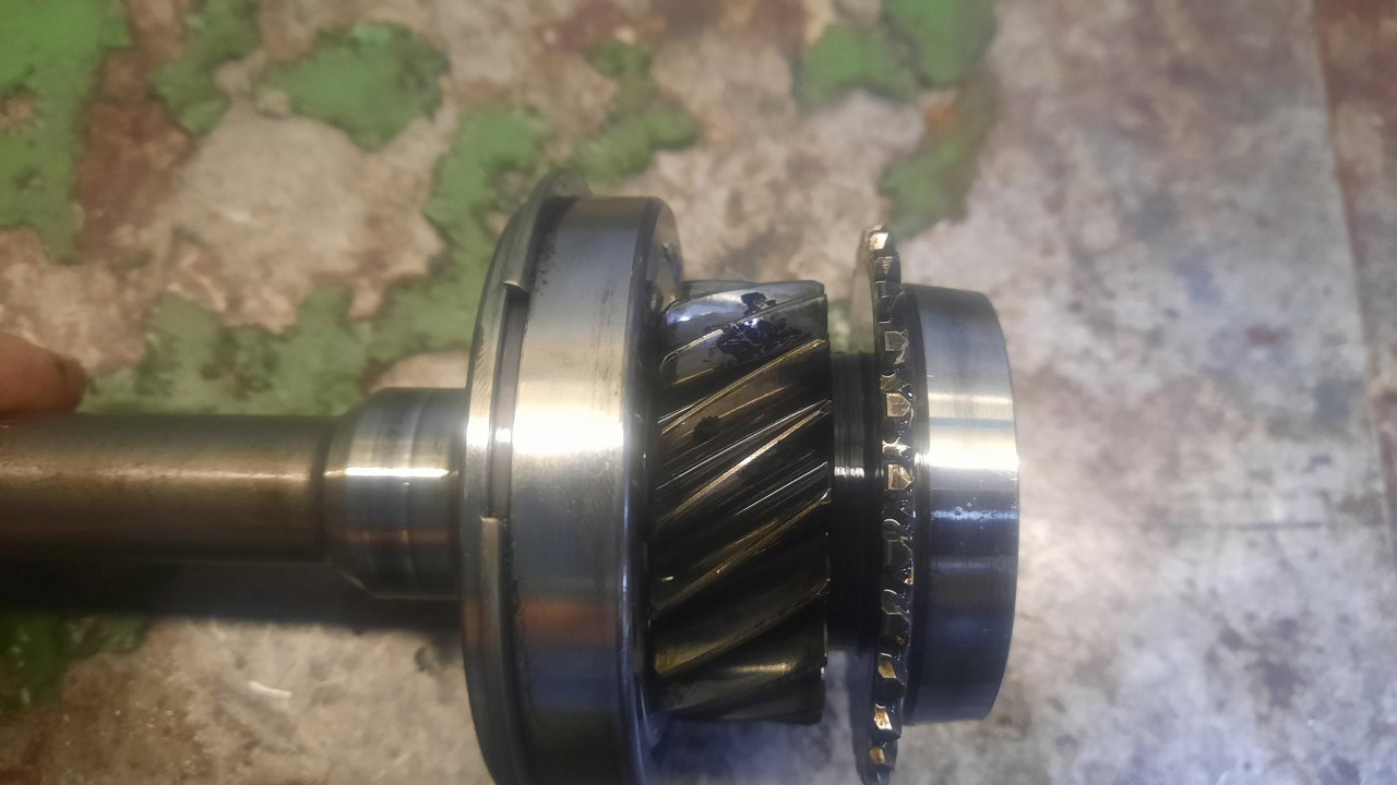 I tu nastąpił zonk. Wałek sprzęgłowy ma na końcu kółko zębate napędzające choinkę. I te kółko zębate ma praktycznie na każdym zębie spory ubytek. I to nie, że ślad - to są głębokie kratery (w kategoriach kół zębatych). Tego niestety nie włożę z czystym sumieniem do skrzyni, więc jest problem. O tyle jest to dziwne uszkodzenie, że współpracujące z tym koło zębate jest w idealnym stanie, bez żadnego śladu uszkodzenia. Wygląda mi to na jakąś wadę materiałową. Na pewno nie jest to korozja, bo cała reszta skrzyni jest czysta.