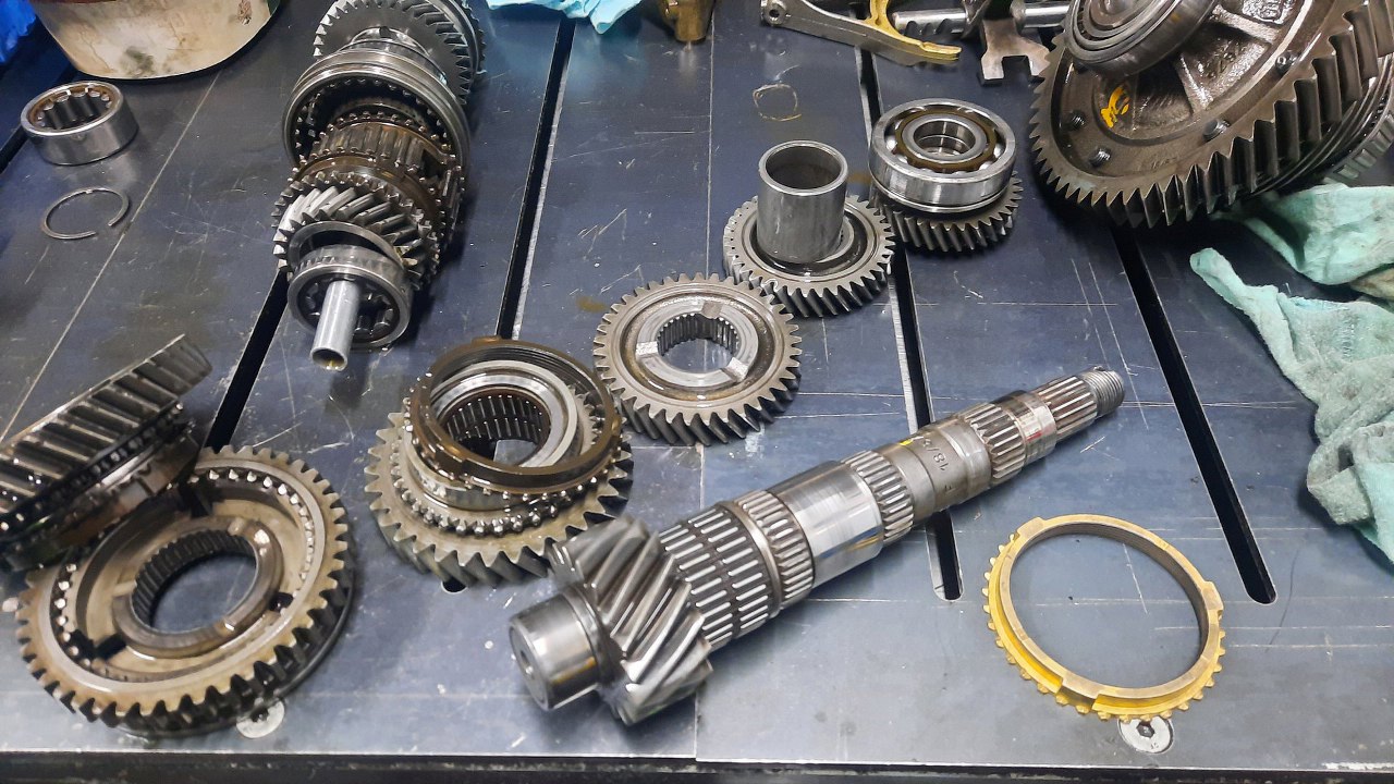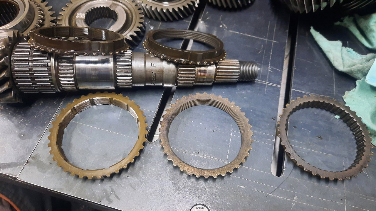 Rozłożyłem części w kolejności składania. Mam tylko jeden nowy synchronizator na biegi 1/2. Niestety części nie są tu łatwe do zdobycia.