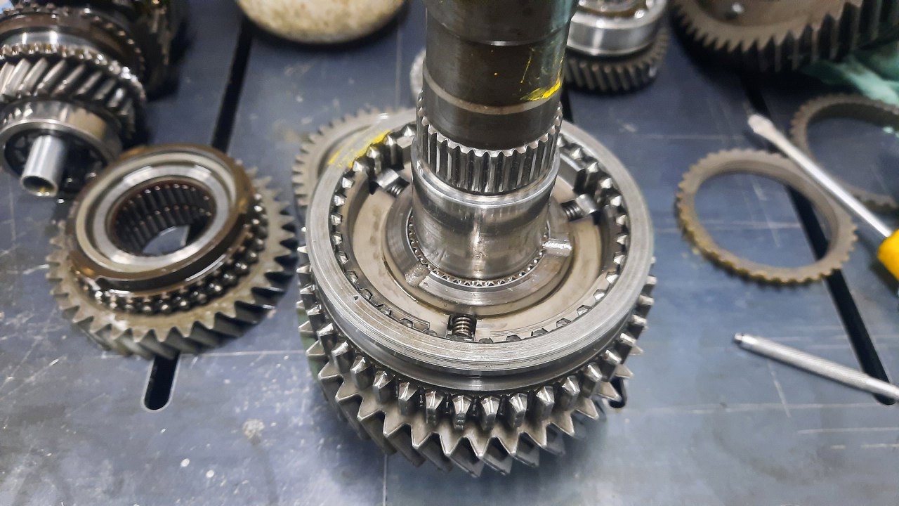Na to wybierak. On jednocześnie jest też kołem od wstecznego biegu. Wsteczny bieg ma prawie zawsze proste zęby. W środku widać, jak prawidłowo są ułożone wałeczki i sprężynki.