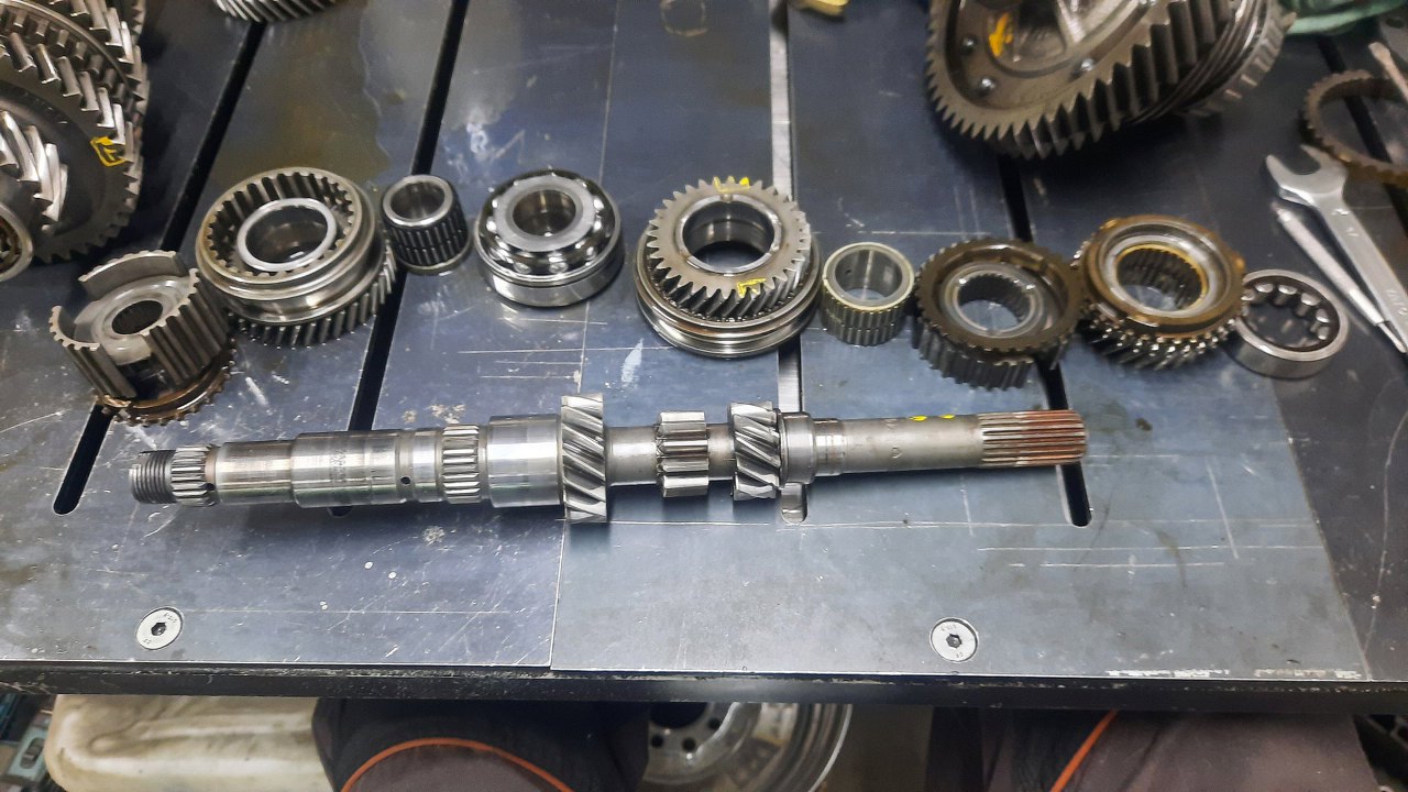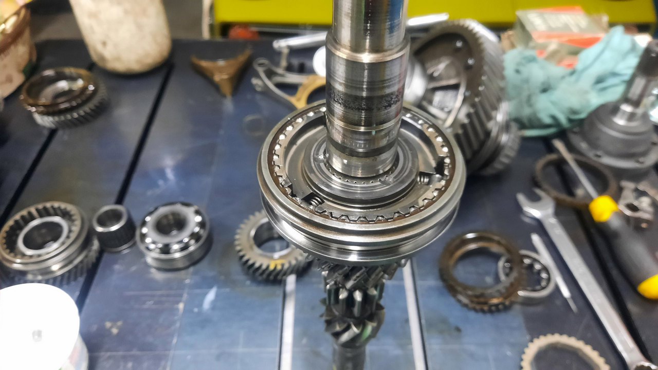 Złożyłem do końca cały wałek wyjściowy. Niepotrzebnie założyłem też koło 5 biegu. Dużo, dużo później, po założeniu wybieraków i obudowy, dopero da się sprawdzić, czy to działa jak trzeba. I wtedy okazało się, że ten przesuwany element, który załącza biegi 1 i 2, nie przesuwa się swobodnie po zębach wewnątrz i praktycznie uniemożliwia wbicie jednego biegu. Musiałem to zmienić na część z drugiej skrzyni, co zlikwidowało problem. Potem pytałem właściciela, czy były problemy z wbiciem 1 czy 2, to rzeczywiście coś było. A nieważne z którym był problem, bo część pod spodem jest symetryczna i można założyć ją w dowolną stronę :).