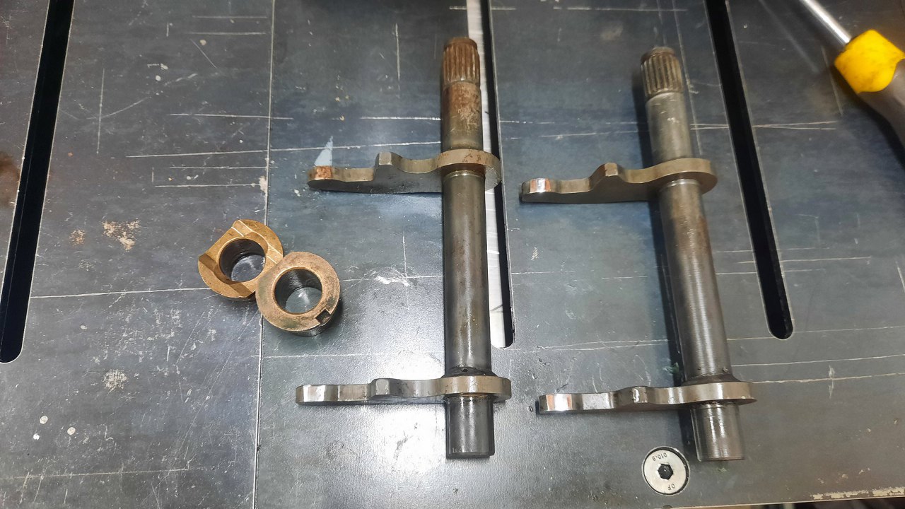 Po rozłożeniu skrzyń zacząłem przygotowywać resztę drobiazgów. Tu jest ten mechanizm poruszający wybierakami biegów. Niby ok, ale to, co wystaje ze skrzyni, jest skorodowane, więc warto by było go ocynkować. Ale w całości tego przecież nie oddam...
