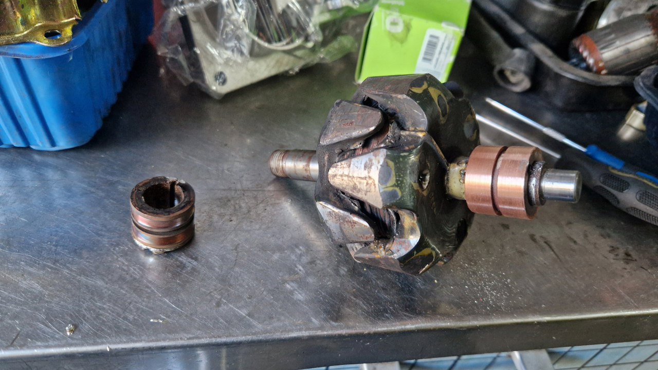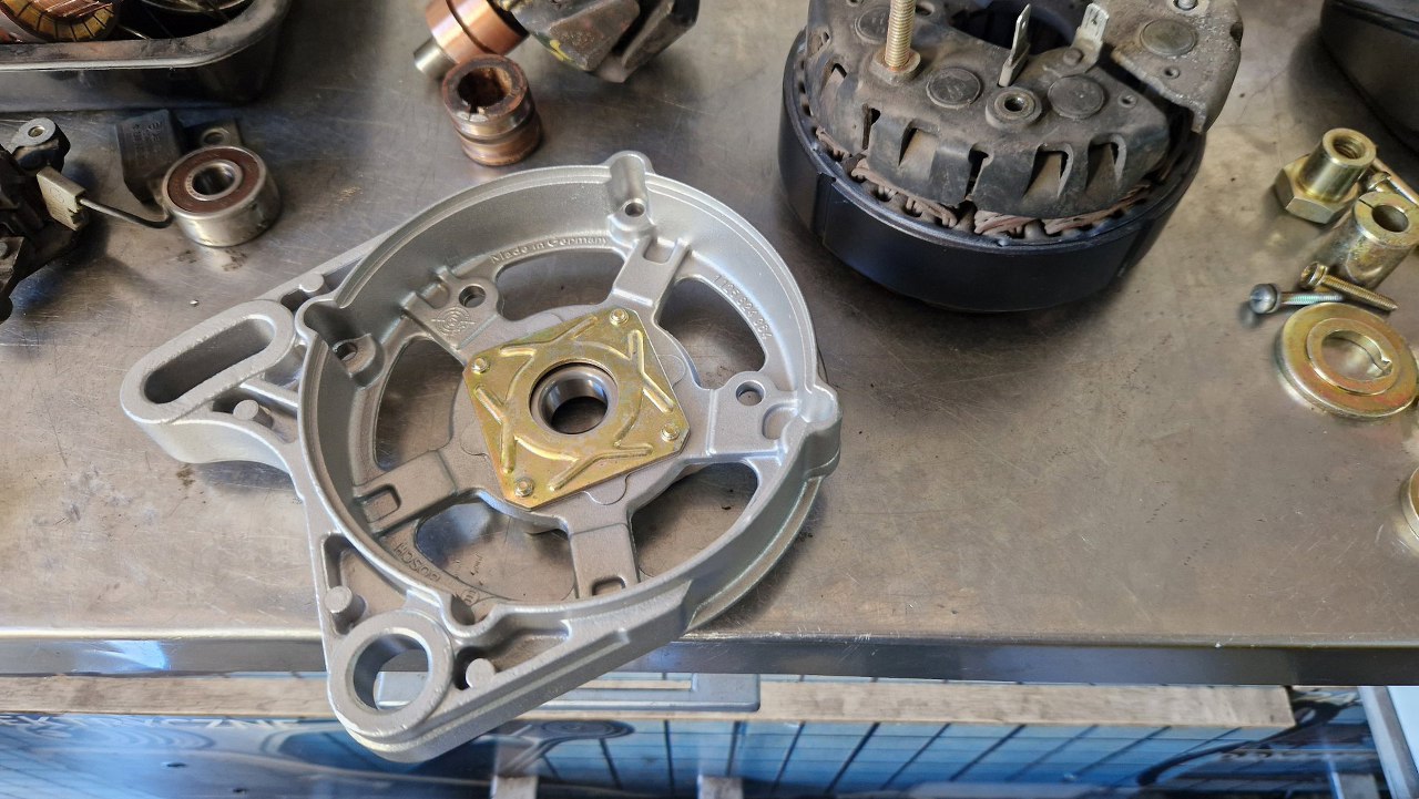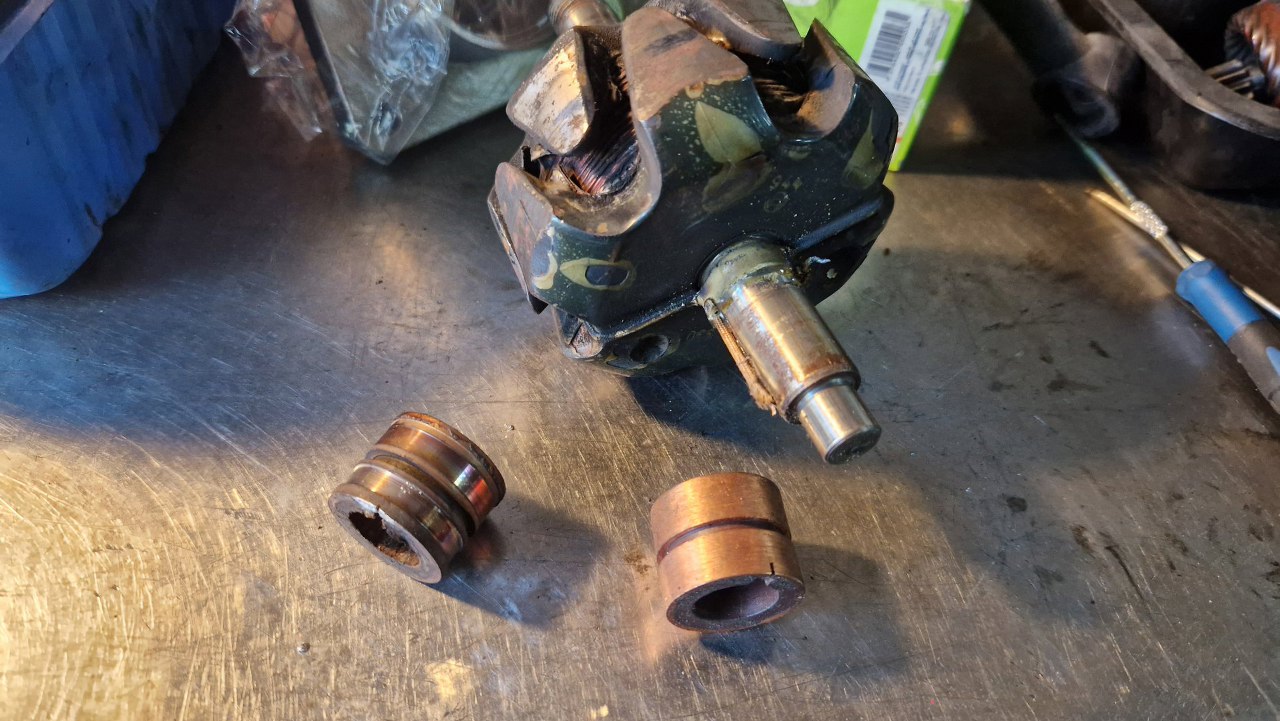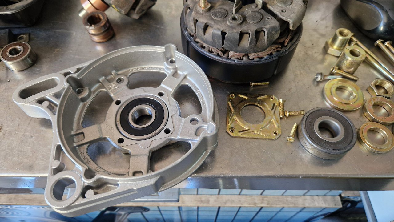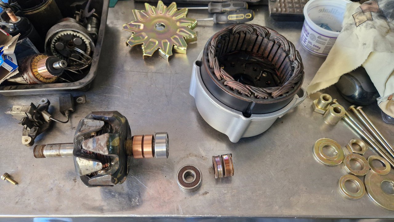 Wkrótce miałem gotowe części aluminiowe po szkiełkowaniu, a stalowe po cynkowaniu. Trzeba to wszystko z powrotem poskładać. Zaczynam od wymiany ślizgu wirnika alternatora. Kiedyś stwierdziłem, że fajnie by było być trochę odciążonym od takich prac i oddałem alternator do regeneracji w renomowanej firmie. Jak dostałem z powrotem alternator, to ślizg ten, zamiast wymieniony, był stoczony do miejsca, gdzie nie było widać zużycia. Nic to, że szczotki ledwo do niego sięgały... I tak się skończył outsourcing :).
