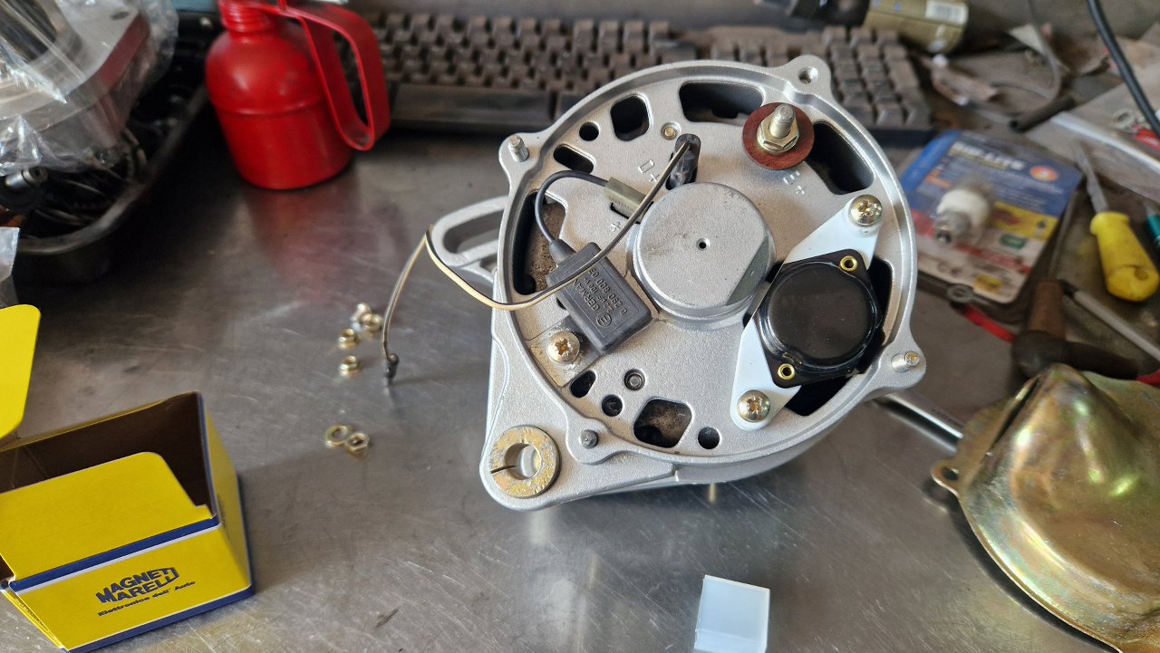 Z tyłu podłączyłem kondensator i nowy regulator napięcia. Specjalnie z lojalności wobec kraju producenta wybrałem Magneti Marelli :).