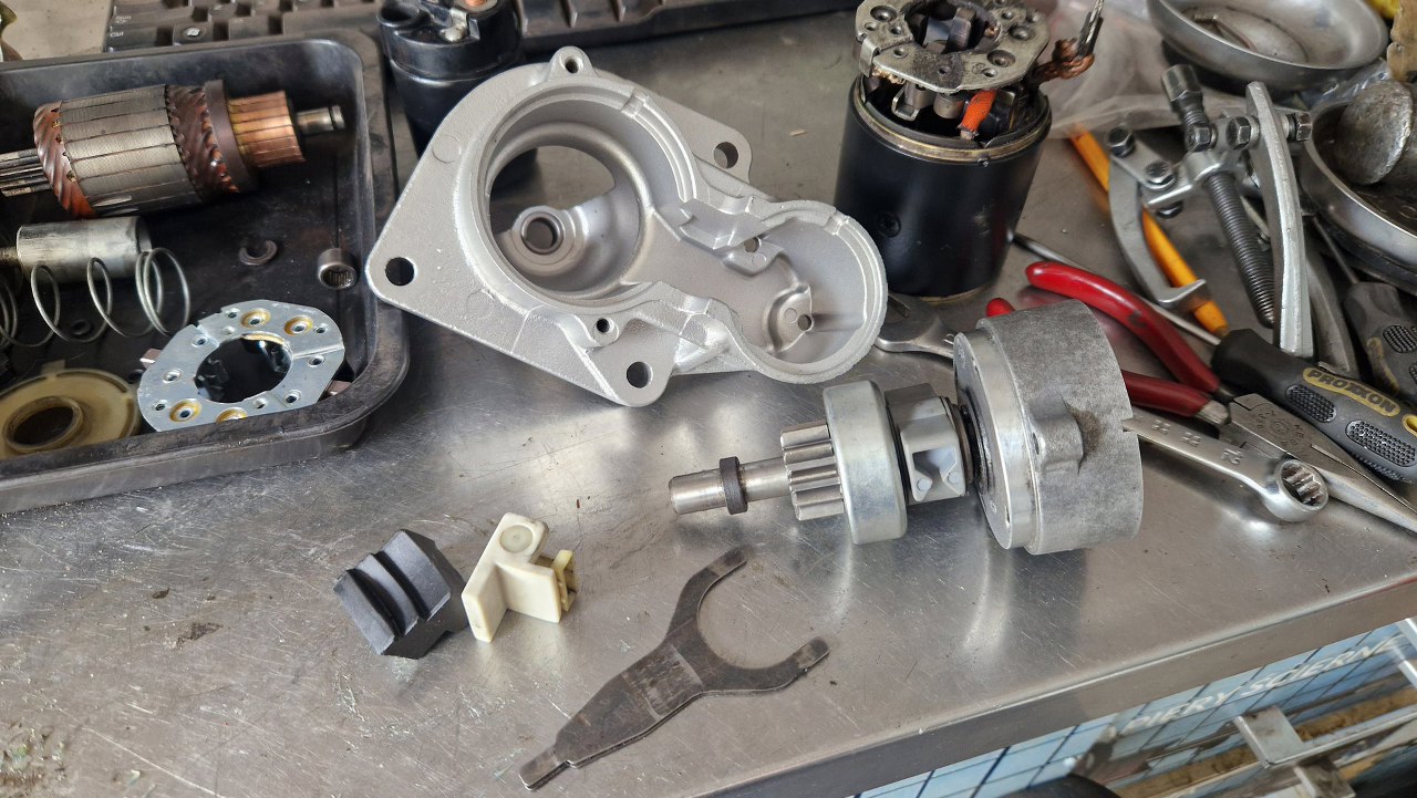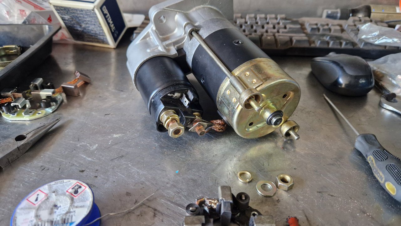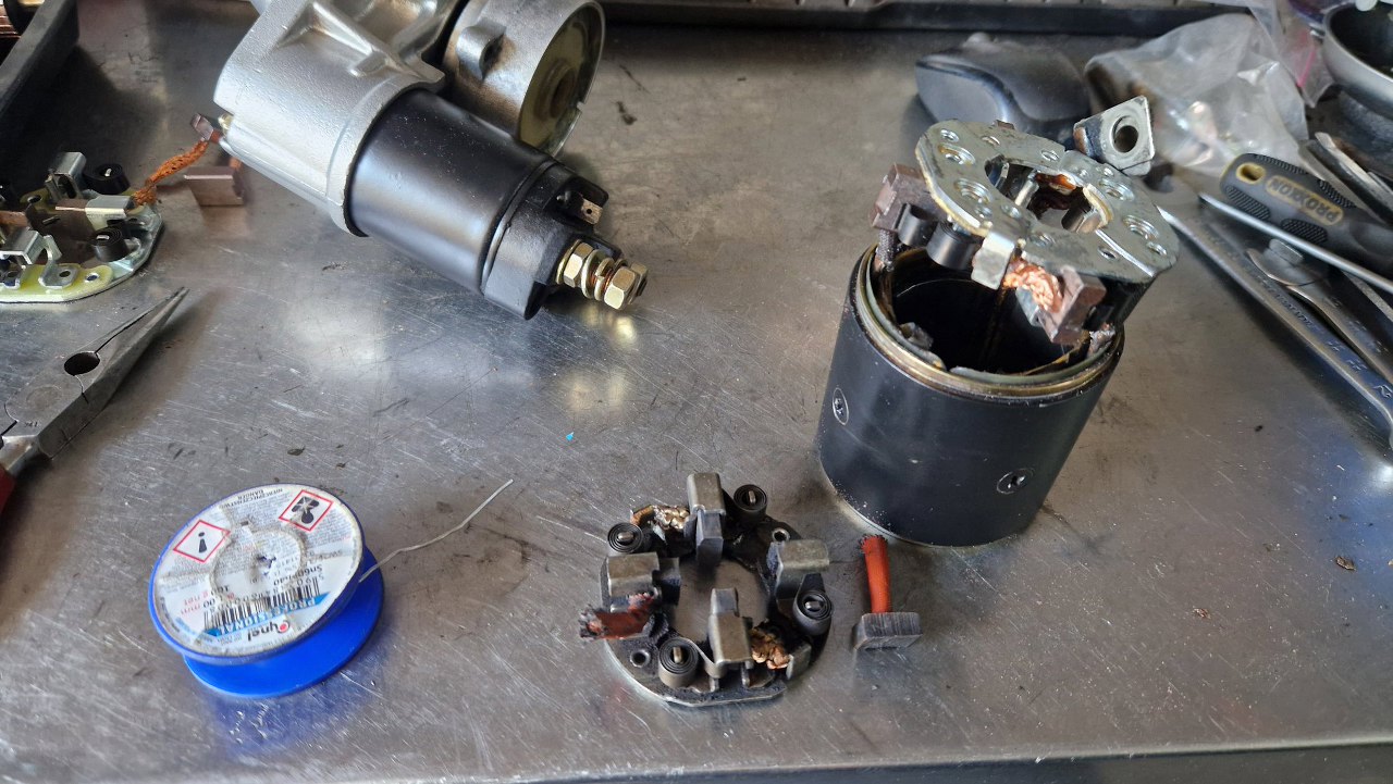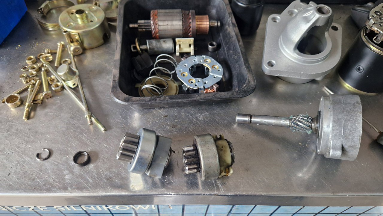Po jego przykręceniu wymieniłem szczotki, razem z całym mocowaniem. W katalogach sąbłędy i kupiłem jeden szczotkotrzymacz, który, jak się okazało, miał tylko dwie szczotki zamiast czterech. Inny - to samo. Dopiero szczotki do tego rozrusznika przyszły 4. Mam więc dwa komplety - jeden użyję, drugi będzie na zapas...