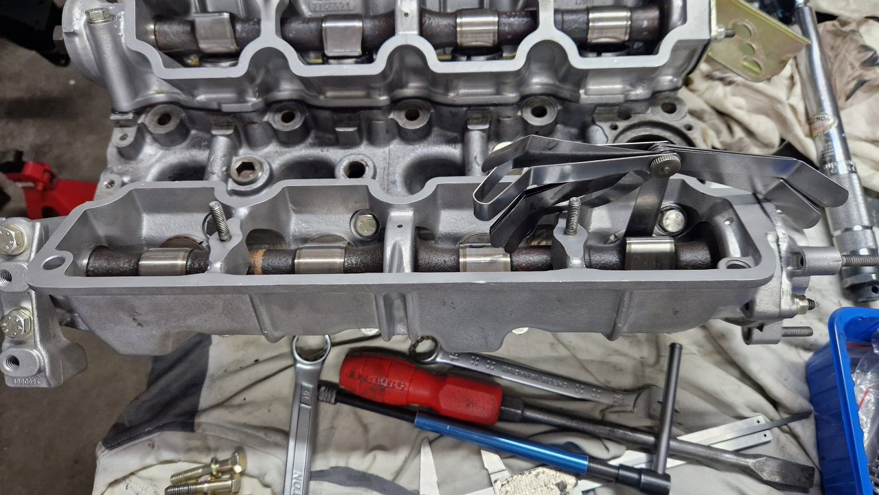 No i teraz mogę zacząć to regulować już na gotowo. Szczelinomierzem mierzę szczelinę między wałkiem a talerzykiem regulacyjnym umieszczonym w popychaczu. Potem wyliczam jaką płytkę potrzebuję tam włożyć i zamieniam ją miejscami. W ten sposób udało mi się wyregulować stronę wydechową.