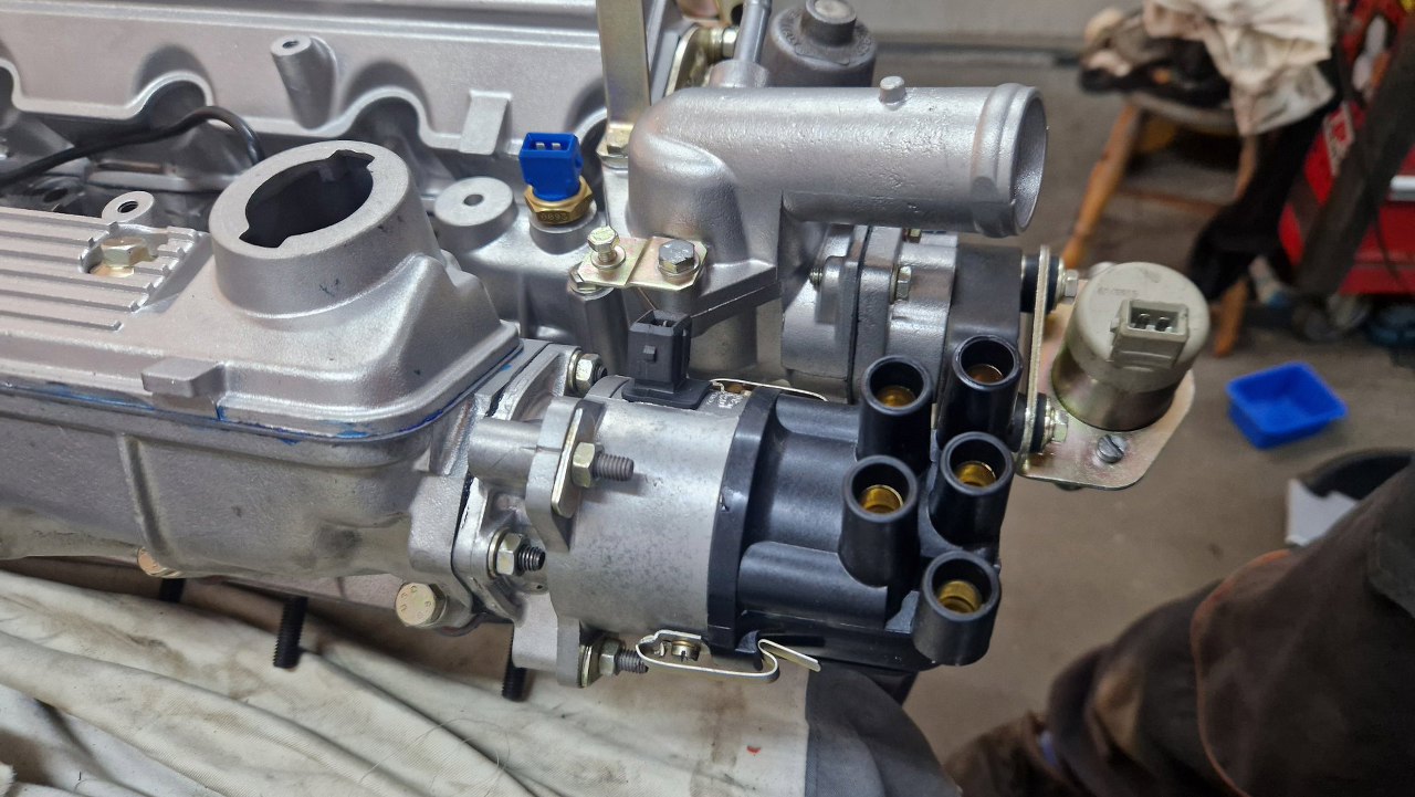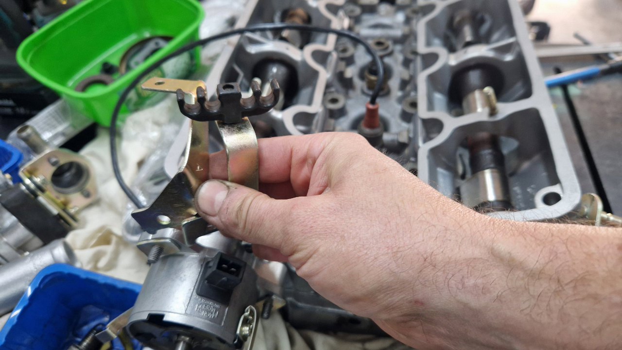 Do złożenia został mi regulator ciśnienia paliwa, po lewej. Jest oddzielny od listwy wtryskowej i przykręcony jest do pokrywki wałka ssącego. Po prawej mam aparat zapłonowy, do którego muszę dokręcić zapinki do kopułki.