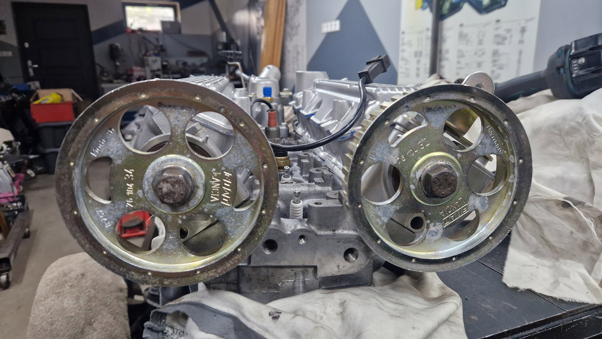Stronę wydechową mam w sumie ogarniętą (czarne kreski stawiałem jak dany zawór miał już ustawiony właściwy luz), więc mogę tu już przykręcić pokrywę. Kółko pasowe jest założone tylko tymczasowo, na odwrót, żeby tylko było łatwiej obracać wałkem rozrządu.