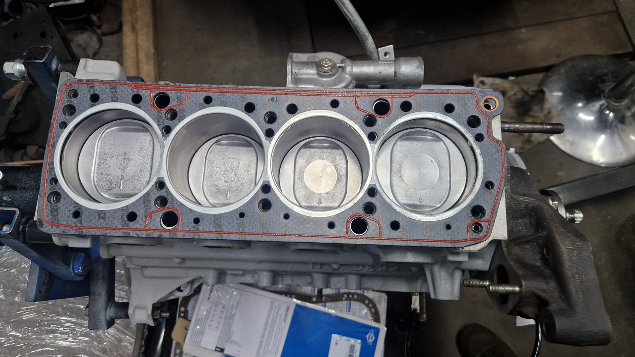 Pora połączyć blok i głowicę. Na blok położyłem uszczelkę. Potem wstawiłem jeszcze dwa kołki ustalające, których brakuje na tym zdjęciu.
