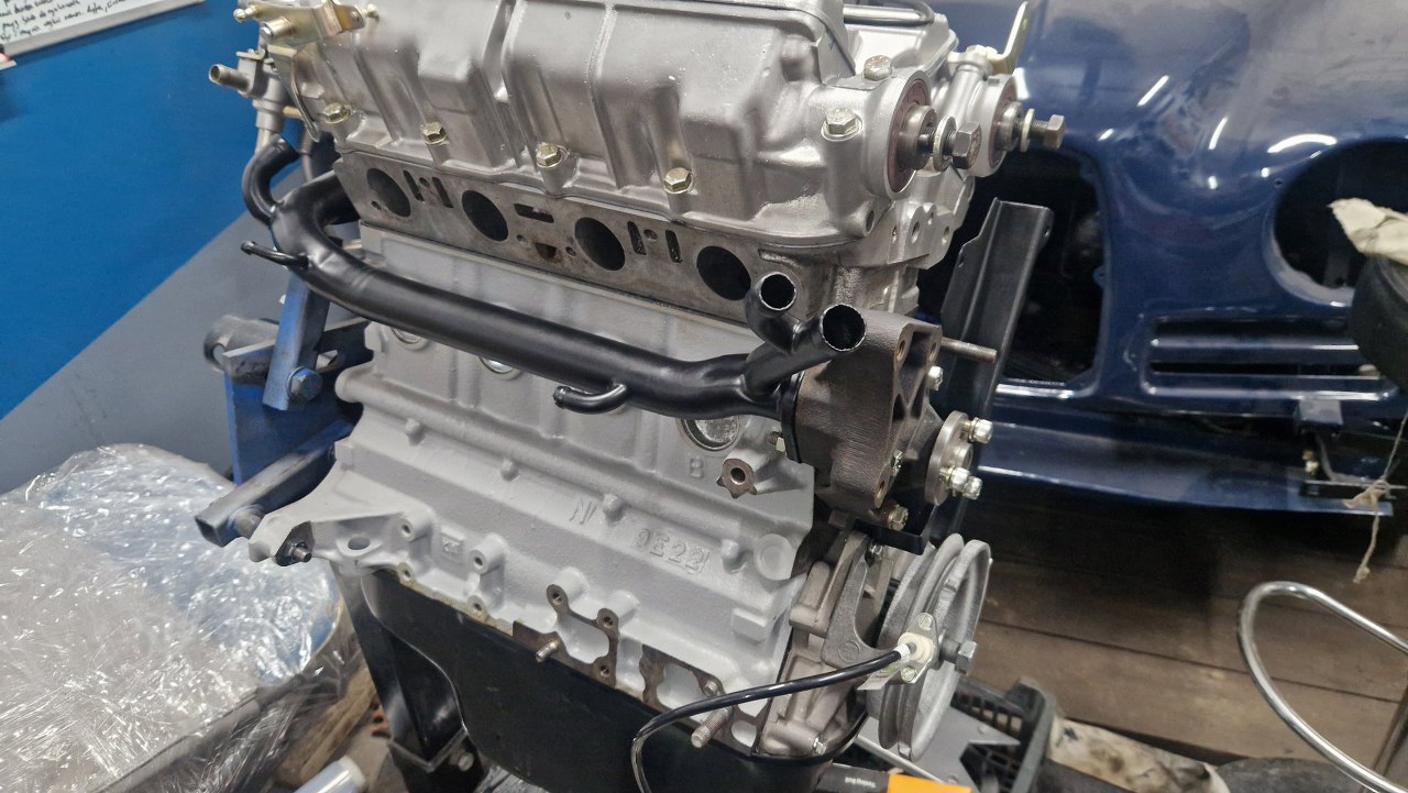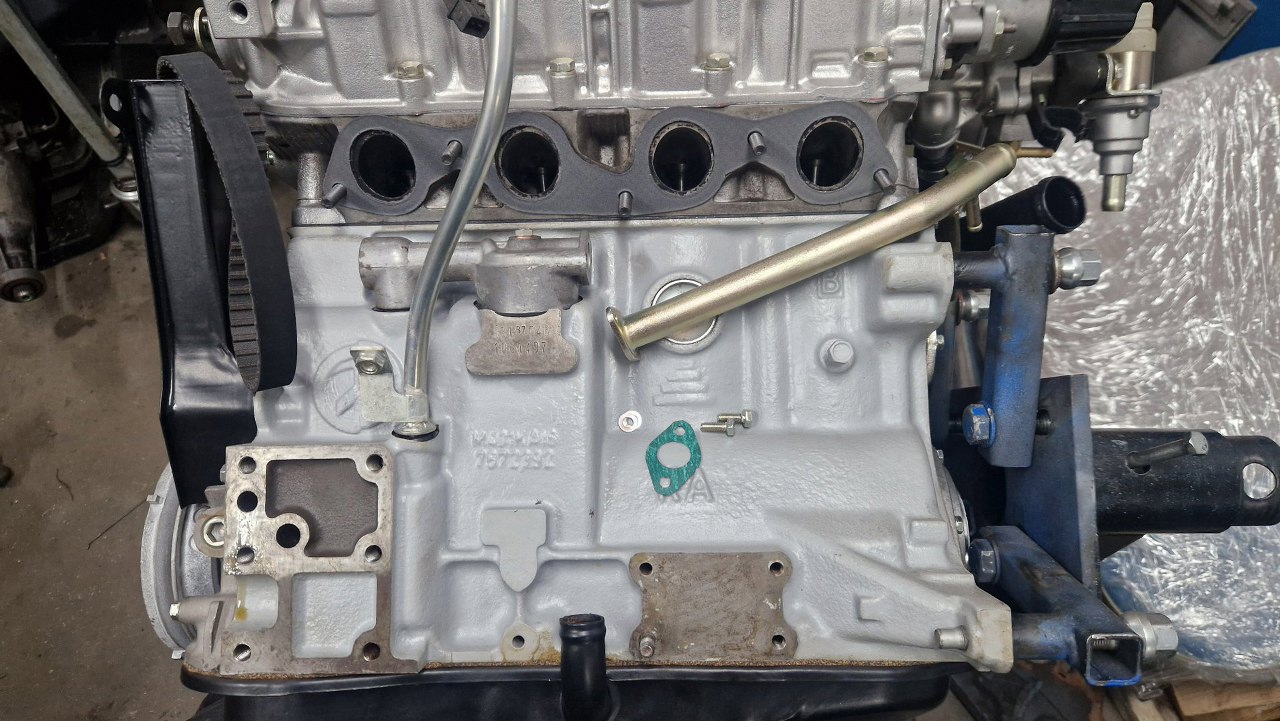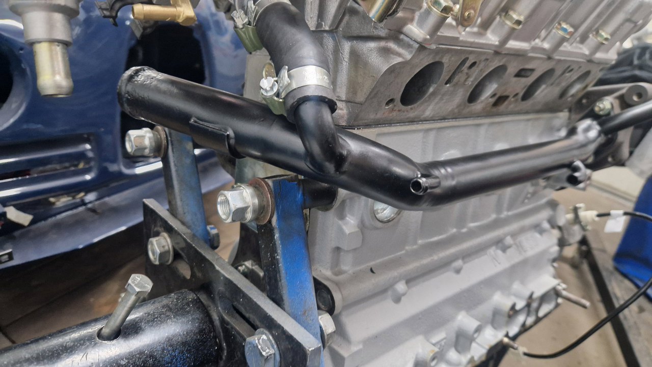 Z drugiej strony bloku przygotowałem rurkę podciśnienia. Po lewej przykręca się ją do odmy, po prawej ma dwa końce - jeden do podpięcia podciśnienia gdzieś w dolocie, drugi do podłączenia serwa hamulcowego (tak podejrzewam). Na dole po lewej jest miejsce na przykręcenie adaptera pod filtr oleju, może i wymiennik ciepła olej/woda tam jest? Ten cały element jest w samochodzie, bo nie dało się odkręcić rurek. Zostanie przykręcony dopiero po włożeniu silnika.