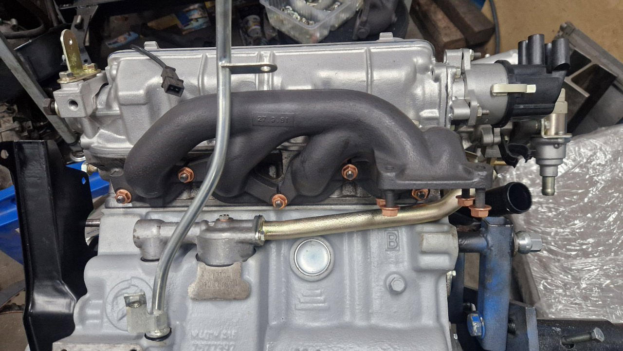 A tu już przykręcona rurka i zamontowany w międzyczasie kolektor wydechowy. Turbo nie dostałem i nie dostanę - jest ciężkie i nic nie wnosi do montazu silnika, więc będzie założone pewnie dopiero w samochodzie.