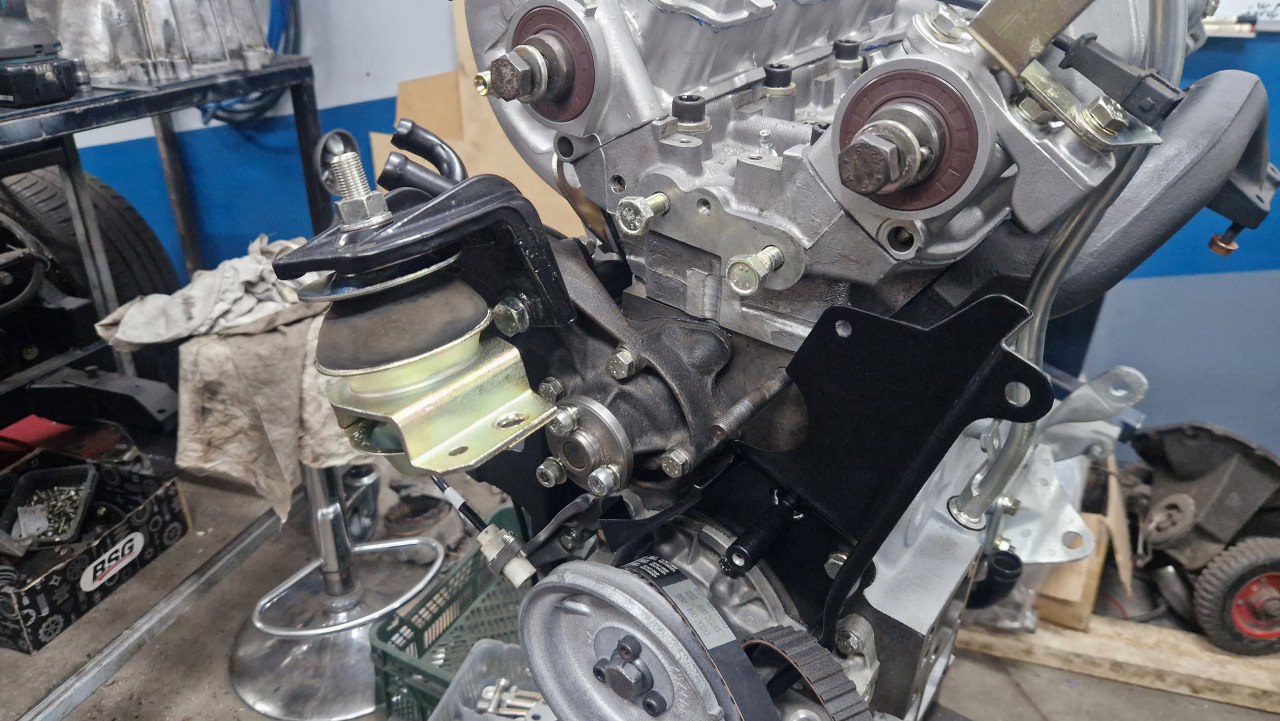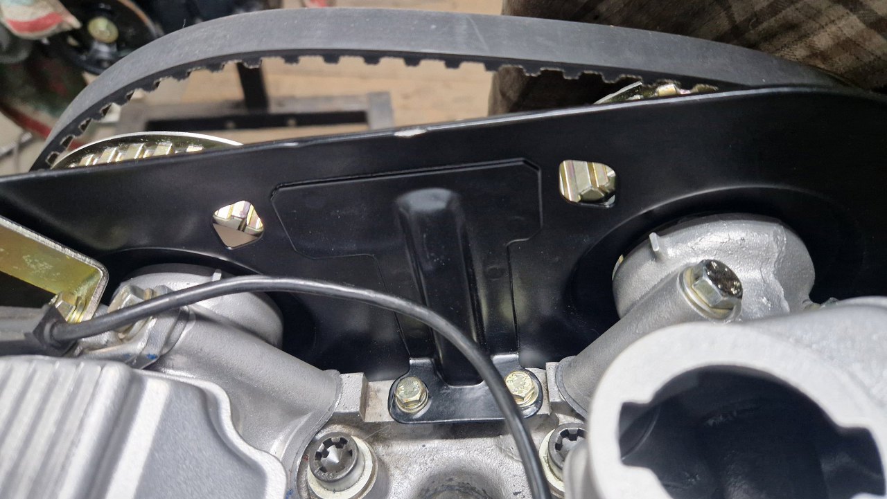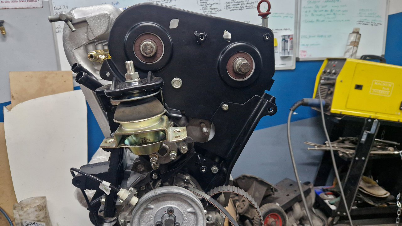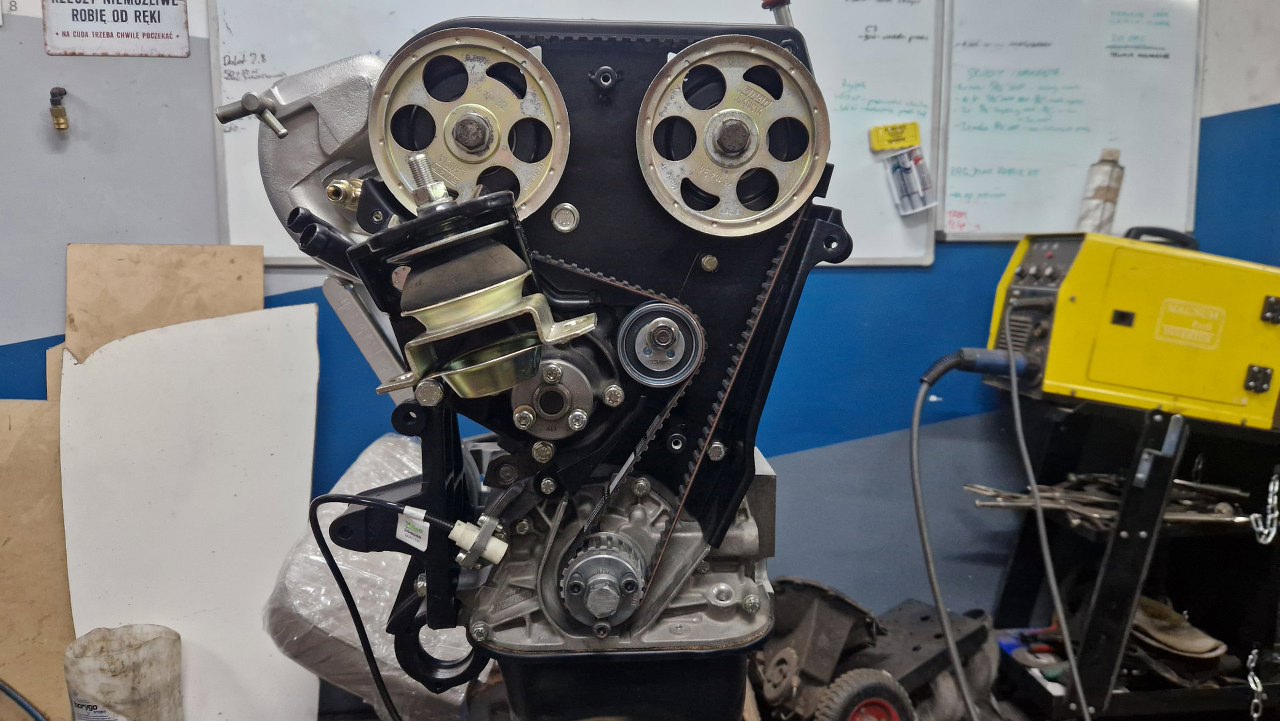 Pora zabrać się za rozrząd. Zdjąłem koła wałków i przygotowałem śruby mocujące blachę pod kołami. Jedna blacha osłaniająca pasek już jest na miejscu. Wcześniej też przykręciłem łapę silnika i poduszkę, ale chyba nie muszę tego zdejmować.