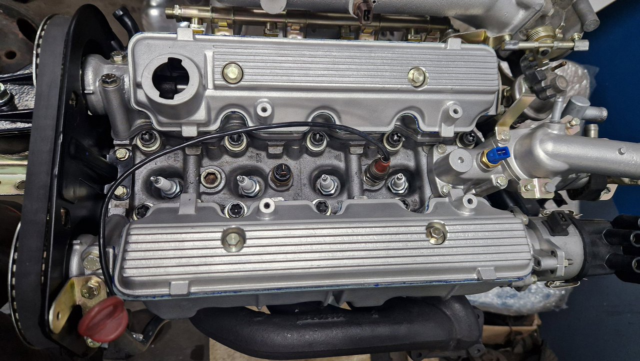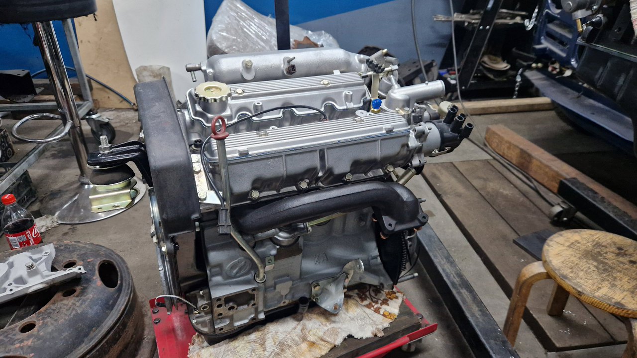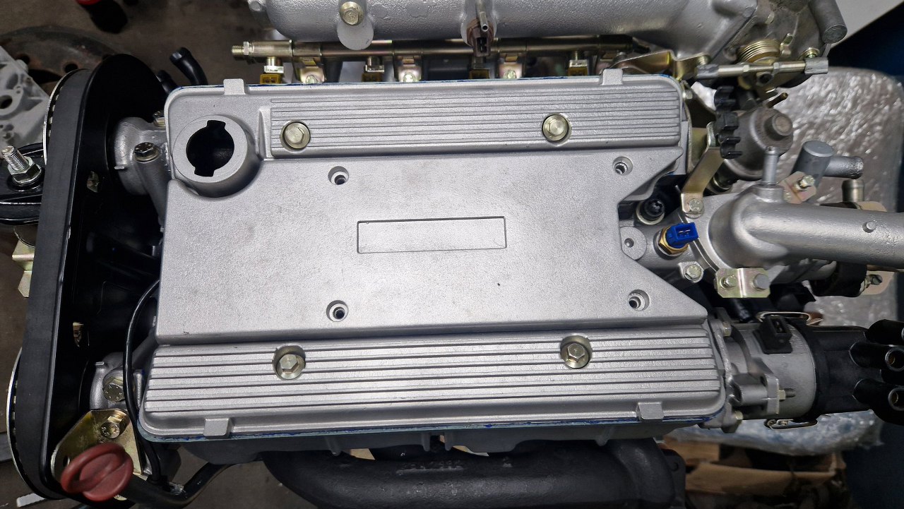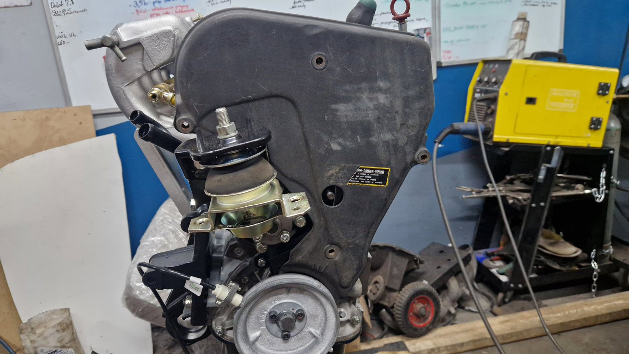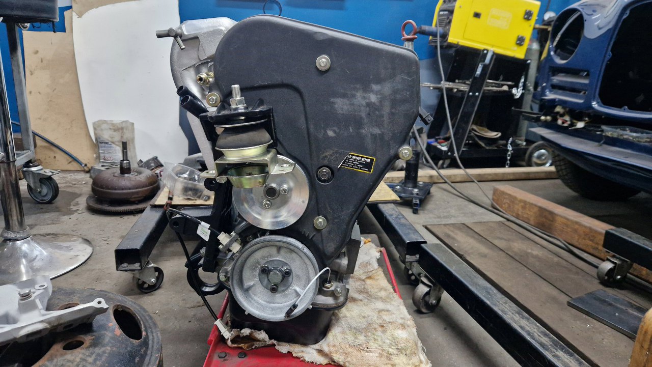 Silnik jest prawie kompletny. Mam jeszcze kawałek układu wydechowego, downpipe, z sondą lambda, ale nie dostałem turbo (nie było takiej potrzeby, będzie zakładane dopiero na samochodzie), więc go tu nie przykręcę.