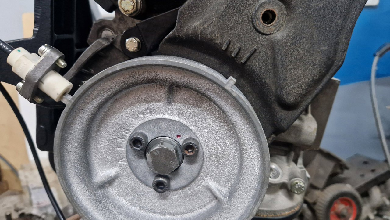 Ustawiłem koło pasowe wału na znacznik na osłonie. Drugi pipsztyk wystający do czujnika halla (czujnika położenia wału korbowego) akurat trafia na czujnik. Czujnik ma regulację podczas przykręcania, można go przesuwać.