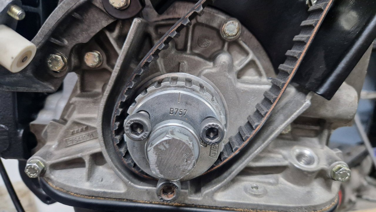 Po czym ponaciągałem całość tak, żeby po zamontowaniu napinacza wszystkie koła miały wciąż znaczniki we właściwych miejscach. Potem zrobiłem dwa obroty wałem, żeby sprawdzić, czy znaczniki nadal się pokrywają. Na koniec zablokowałem wał i dokręciłem śrubę wału korbowego. Ma jakiś spory moment dokręcania, nie pamiętam z głowy, ale coś koło 180Nm.