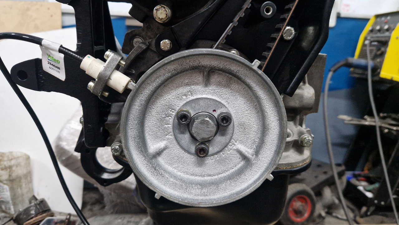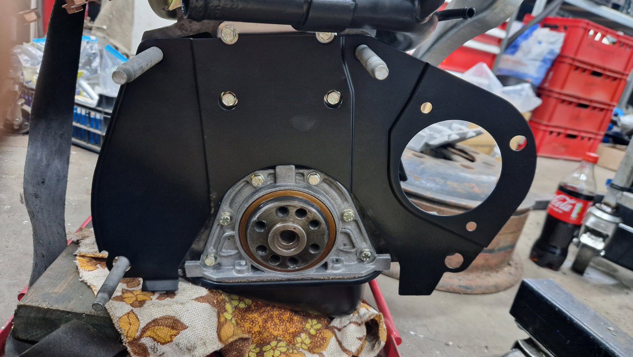 Wkręciłem czujnik oleju i założyłem pokrywę rozrządu. Jest też kółko pasowe pompy wody.