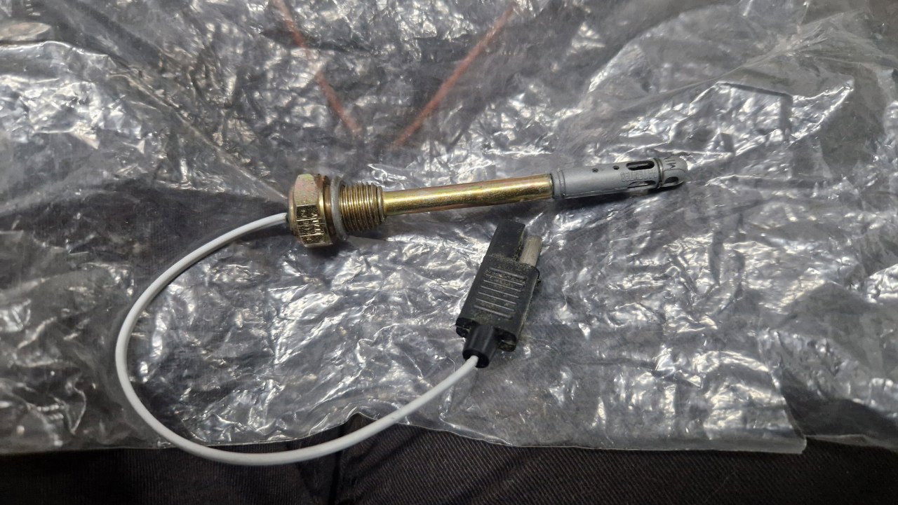 I chyba najbardziej stresująca rzecz w całym silniku. Czujnik poziomu oleju w misce. Część podobno zawsze zepsuta/uszkodzona, nie do zdobycia, ten, nówka sztuka, jakimś cudem znaleziony gdzieś w europie. Możliwe, że ostatni. Miałem na niego uważać bardziej niż na prezenty z komunii. Można go wkręcić dopiero po założeniu miski olejowej, bo miska mogłaby go uszkodzić.