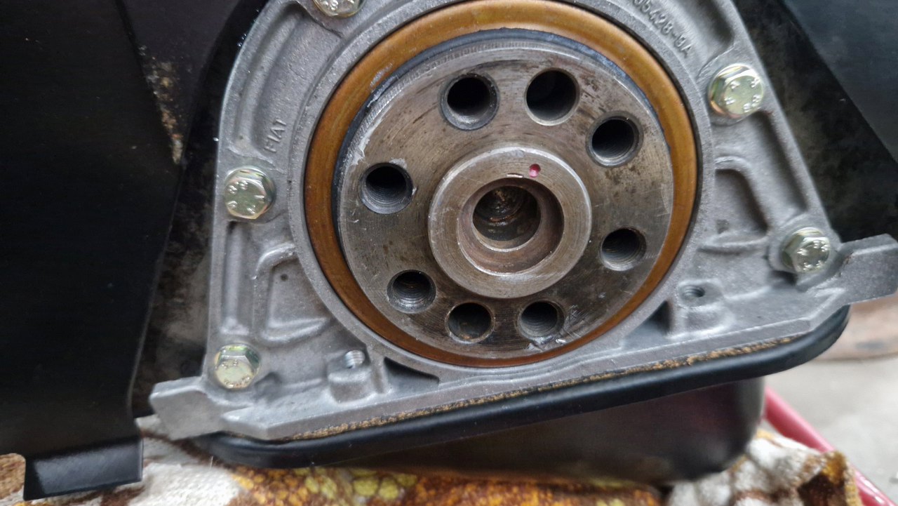 Widać kropkę na wale, pozostawioną przez szlifiernię. Podobna kropka jest na kole zamachowym i oznacza jak mają być ze sobą skręcone te dwie części. Nie wiem tu jak ma wyglądać kwestia łożyska pilotującego skrzynię w wale, więc to zostawiam na później, jak będze montowana skrzynia biegów.