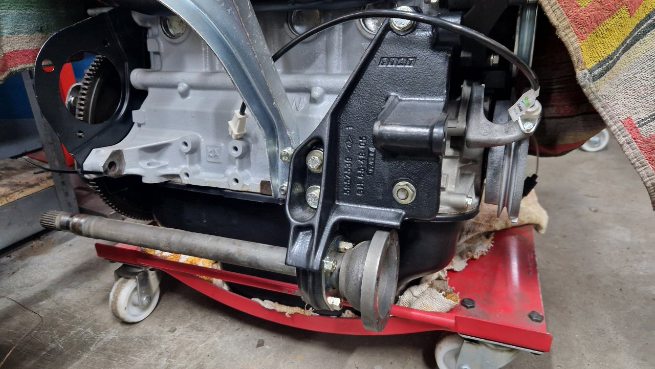 Zdjąłem silnik ze stojaka na wózek. Trudno go postawić, bo w komorze silnika jest pochylony i ma miskę olejową odpowiednio do tego wyprofilowaną. Musiałem go podeprzeć z jednej strony. Przykręciłem szpilki mocujące skrzynię i nasunąłem na nie blachę idącą pomiędzy silnik a skrzynię biegów.