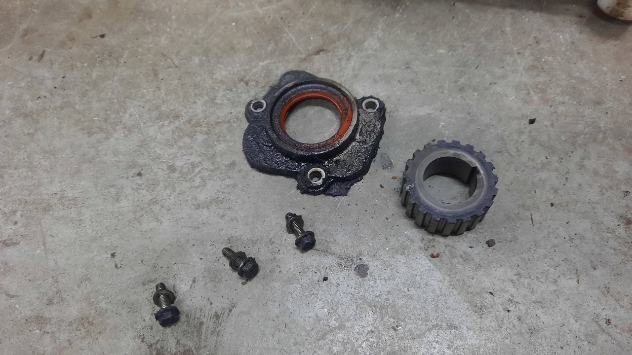 Działam dalej. Odkręciłem pokrywkę wałka pomocniczego. Zdjąłem też kółko napędzające pasek rozrządu z wału korbowego.