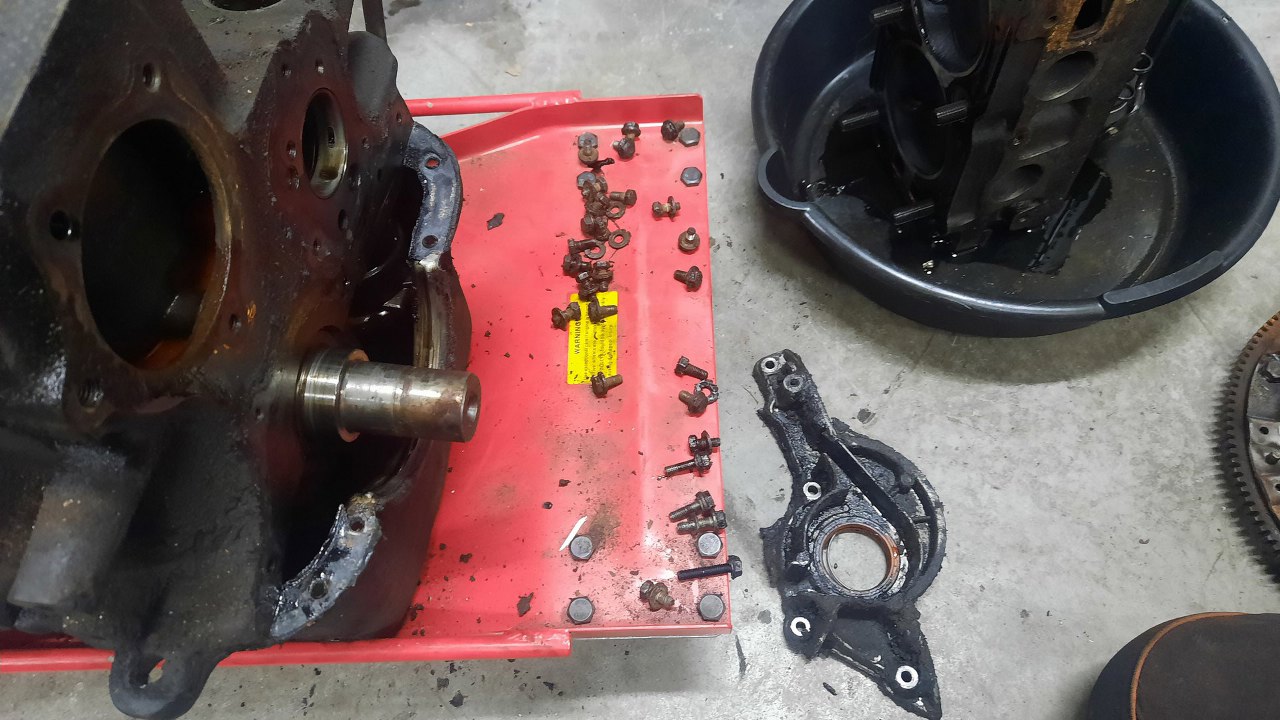 Rozkręcam dalej. Głowicę co prawda na razie zostawię, obejrzę obie później i wybiorę lepszą. Wracam do bloku silnika. Odkręciłem pokrywkę przednią wału korbowego i wszystkie śruby miski olejowej.