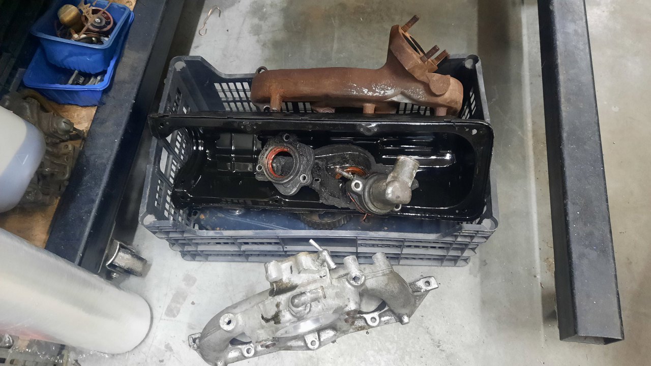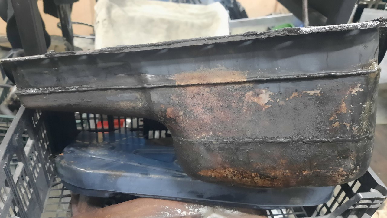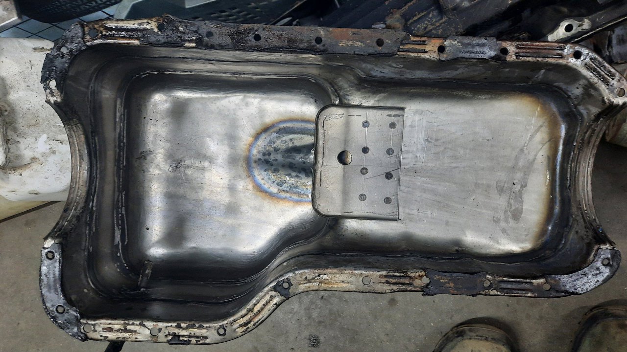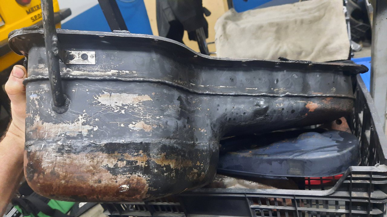 Potem umyłem części, które trafią do piaskowania (dzięki temu piaskowanie jest tańsze, bo piaskarz nie klnie, jak mu się piasek od usmarowanych części odbija albo do nich przykleja). Miska olejowa jest bardzo interesującej konstrukcji. Górna część, przylegająca do bloku, jest od Forda. Dalej miska jest już przerobiona tak, żeby głębsza część była z przodu silnika. O tyle jest to interesujące, że w sumie miska składa się z trzech części - widać dwa ciągłe spawy dookoła. Po prawej stronie pośrodku widać przetłoczenie - tego nie powinno tu być, jest to wgniecenie. Muszę to naprawić.