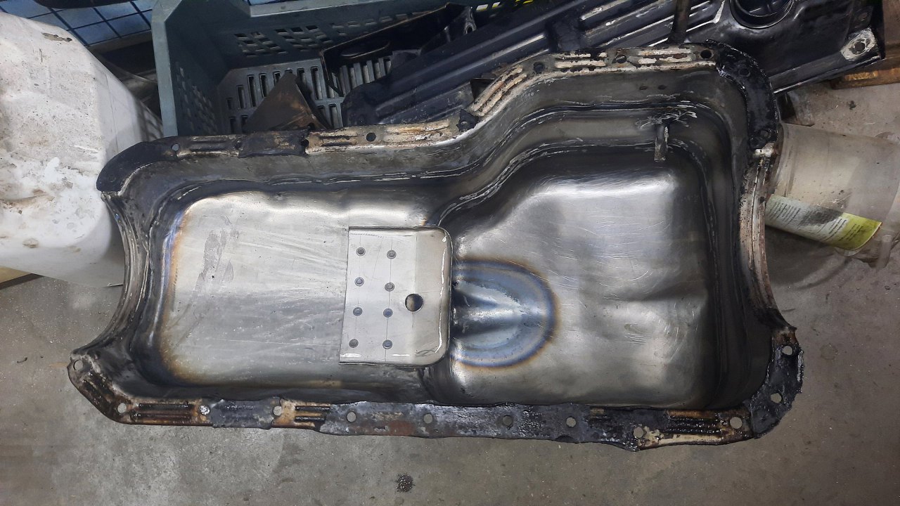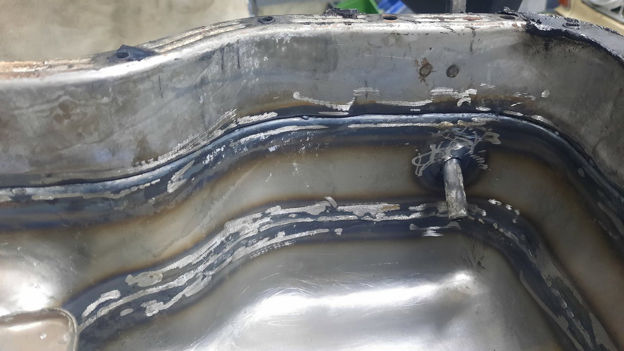 Tu dokładniej widać łączenie części miski olejowej. Ślady szlifowania są jeszcze z FSO. Przy 500 wyprodukowanych sztukach, jest to jednostkowa produkcja, gdzie nie dziwi poziom jakości wykonania :). Nikomu nie opłacałoby się robienie do tego miski oleju od zera.