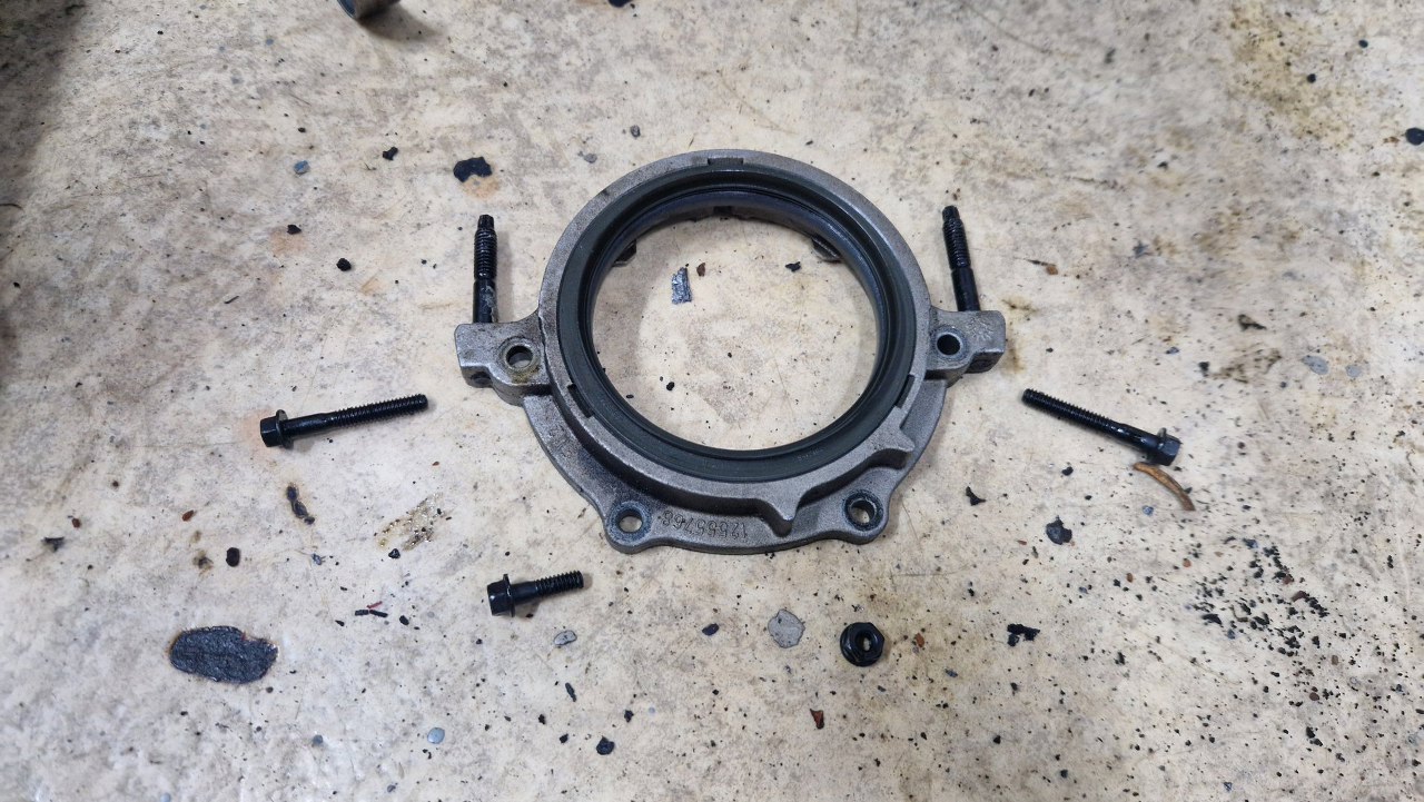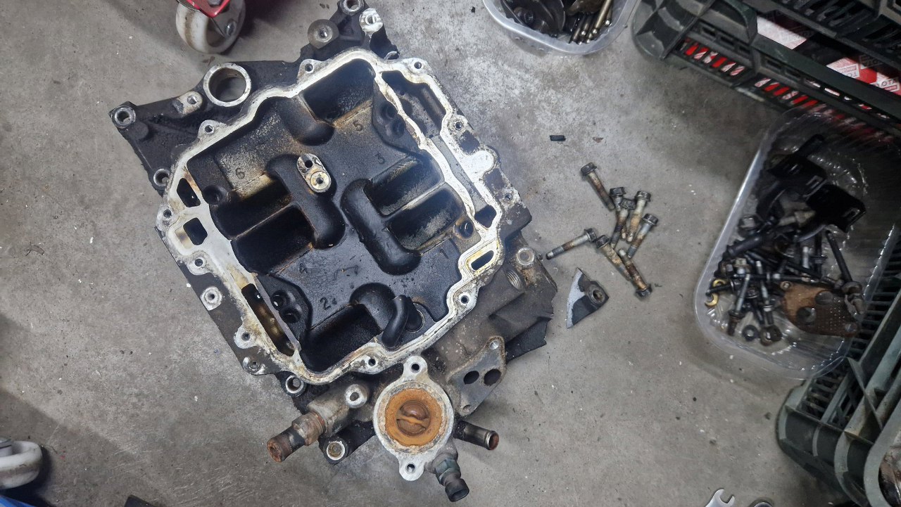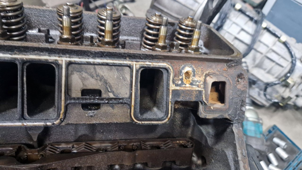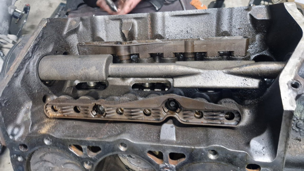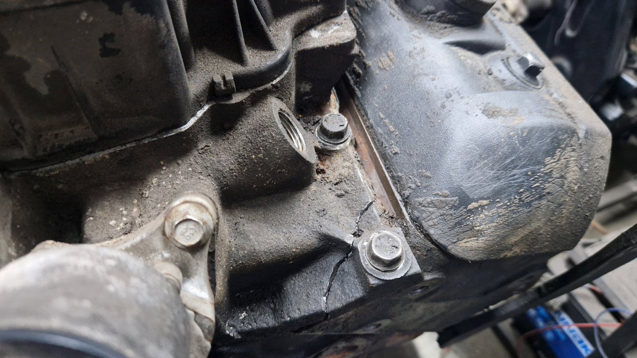 Czy też pęknięty kolektor dolotowy. Potem będzie widać, że silnik po rozłożeniu i diagnozie został poskładany w całość do transportu, ale w tym miejscu zabrakło rożka uszczelki - stąd przykręcenie tego udarem ułamało fragment aluminium.
