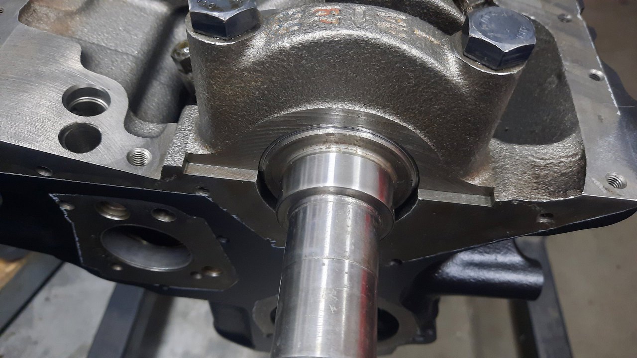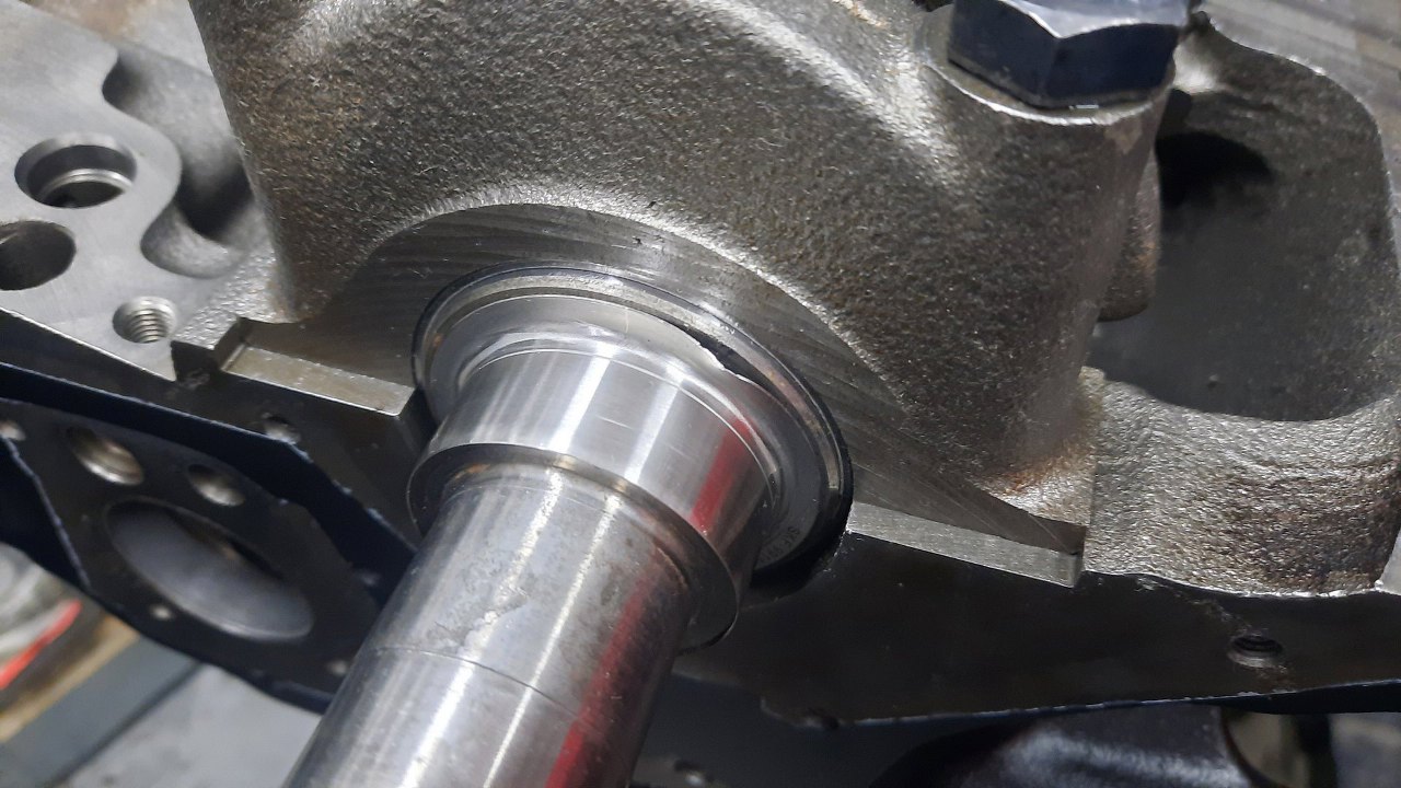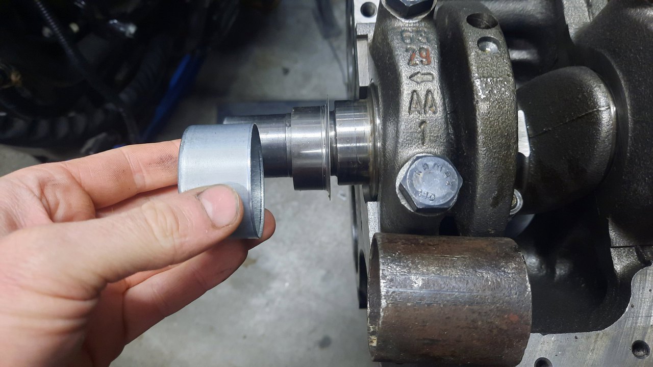 Zarówno wał korbowy, jak i wałek pomocniczy, mają w miejscu pracy uszczelniacza wytarty rowek. Tu zastosuję tuleję naprawczą. Widać ją już nałożoną luźno na wał. Do niej zawsze jest taki kapturek dodany, jako narzędzie do instalacji, ale wał jest w tym miejscu dość długi. Dlatego mam inne narzędzie - to ten kawałek rury obok :).