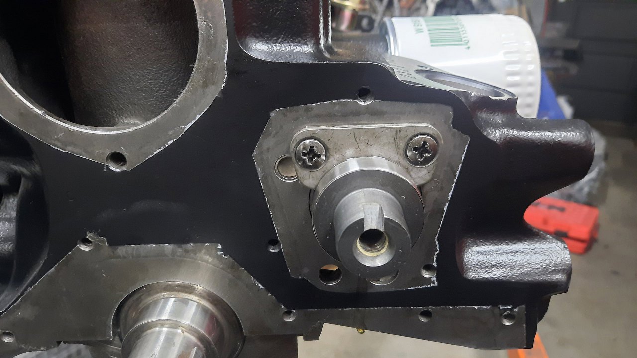 Potem już mogłem włożyć wałek do bloku i przykręcić jego mocowanie.