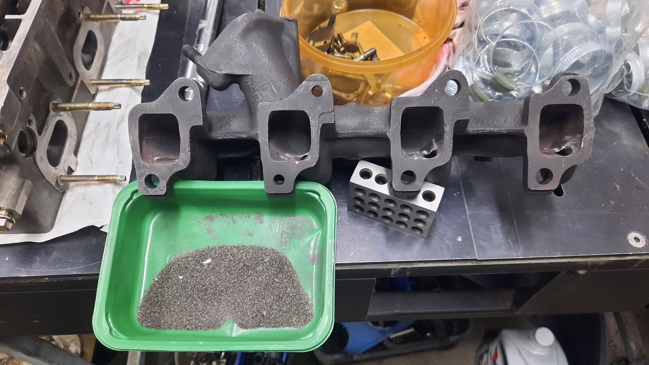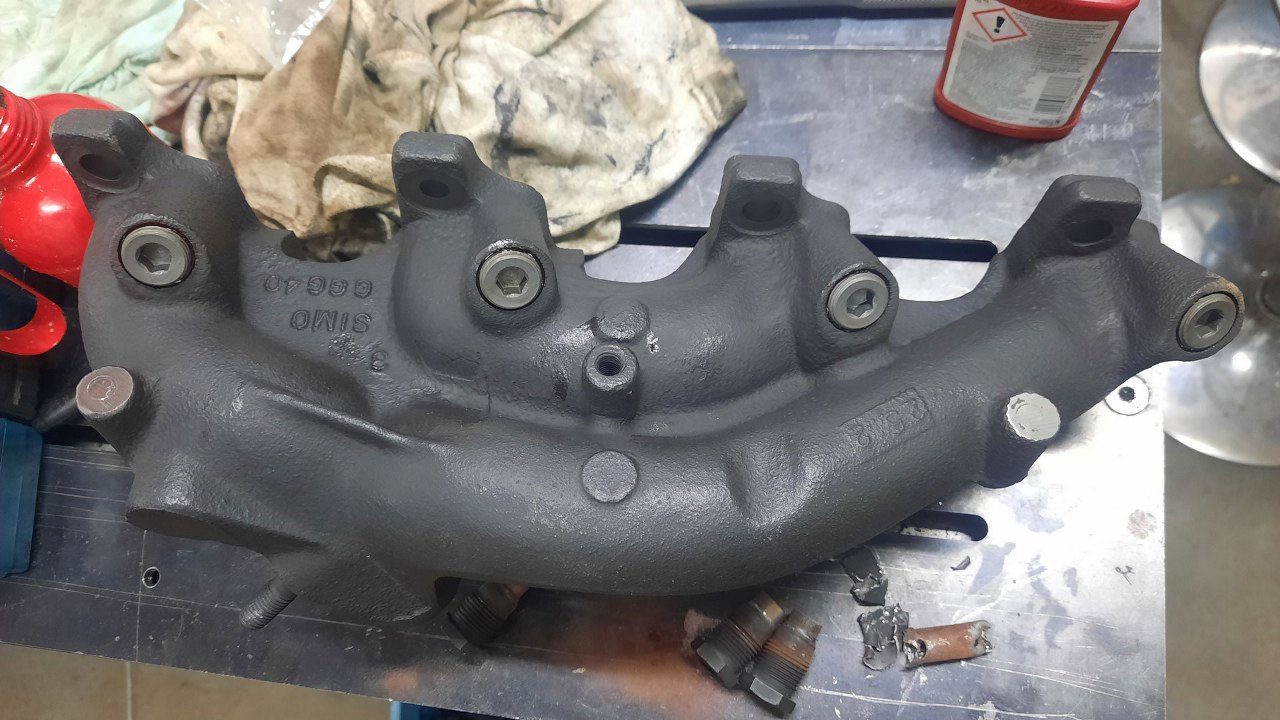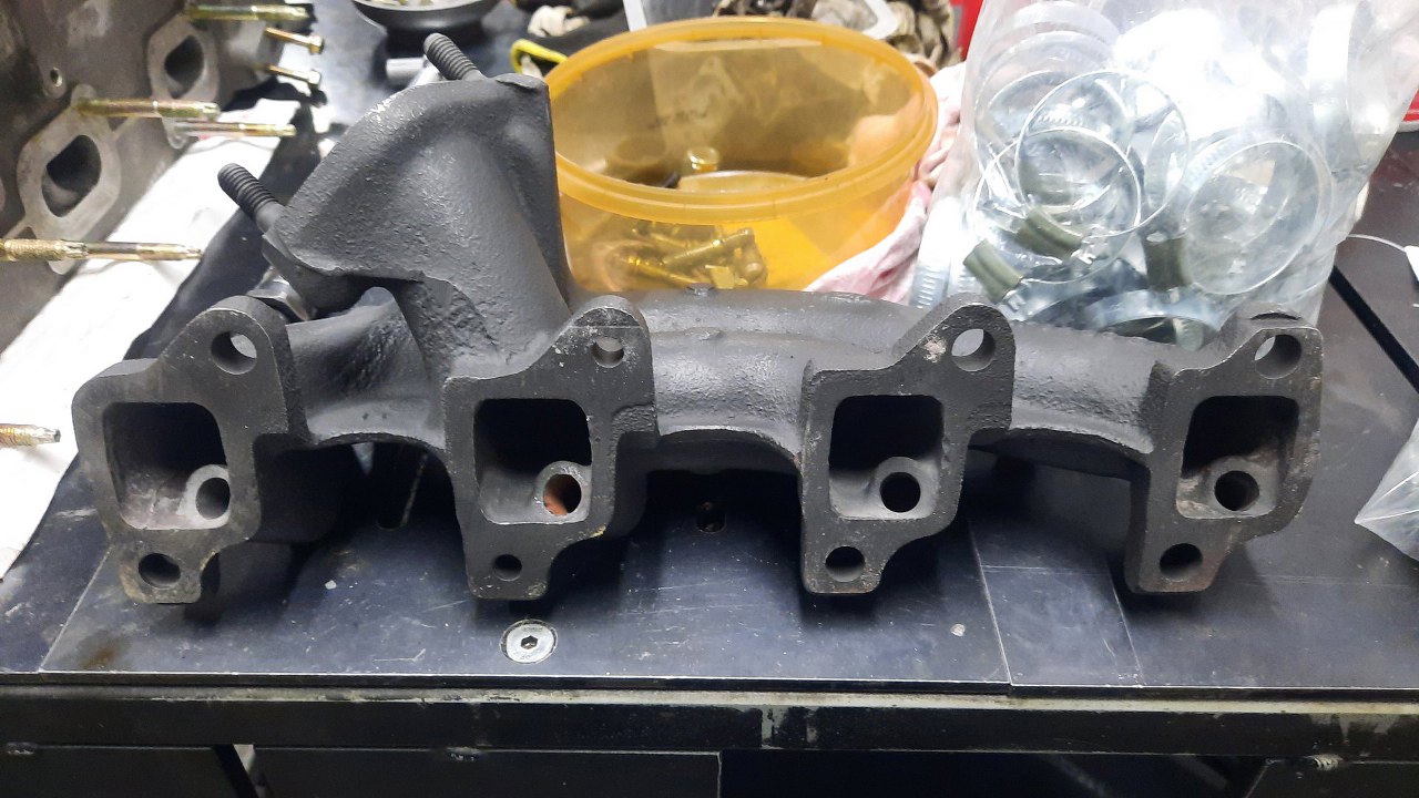 Kolektor wydechowy na pewno użyję ten, co był przy silniku, bo jest całkiem niezły. Pozostałością po jego opakowaniu, czyli Fordzie Sierra, jest ekologia, czyli wkrętki w kolektor związane z EGR. Tego mogę się pozbyć, więc wykręciłem to, co z tych wkrętek zostało. Na ich miejsce trafią korki. Kolektor był wypiaskowany i pomalowany lakierem wysokotemperaturowym.