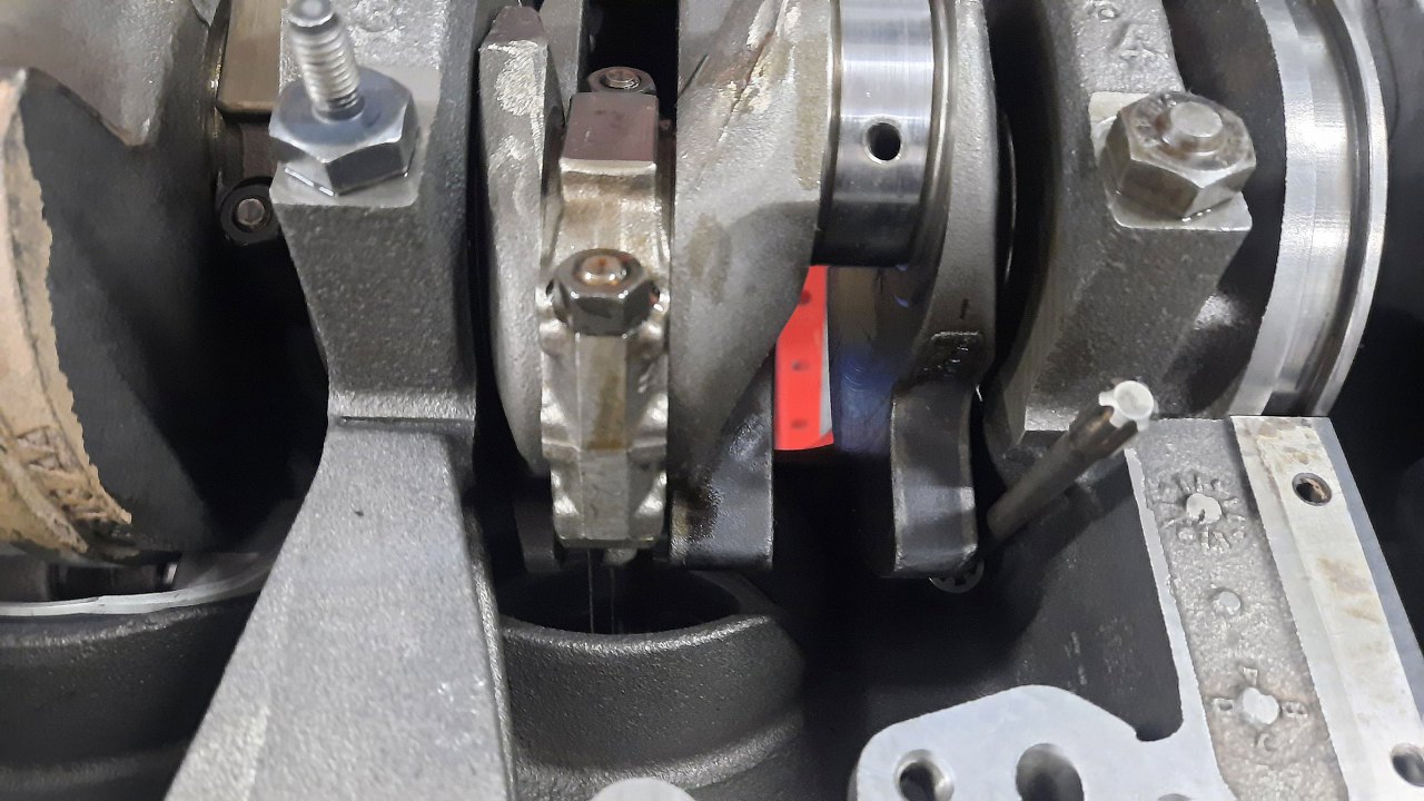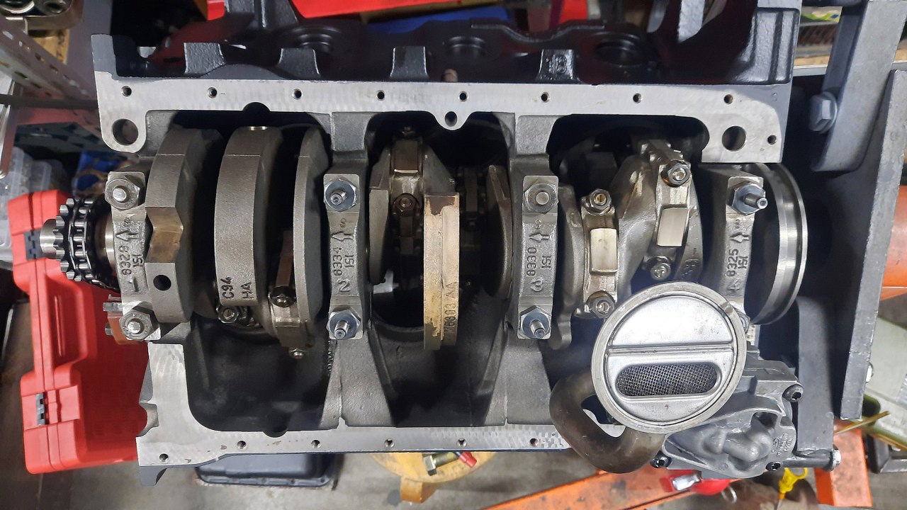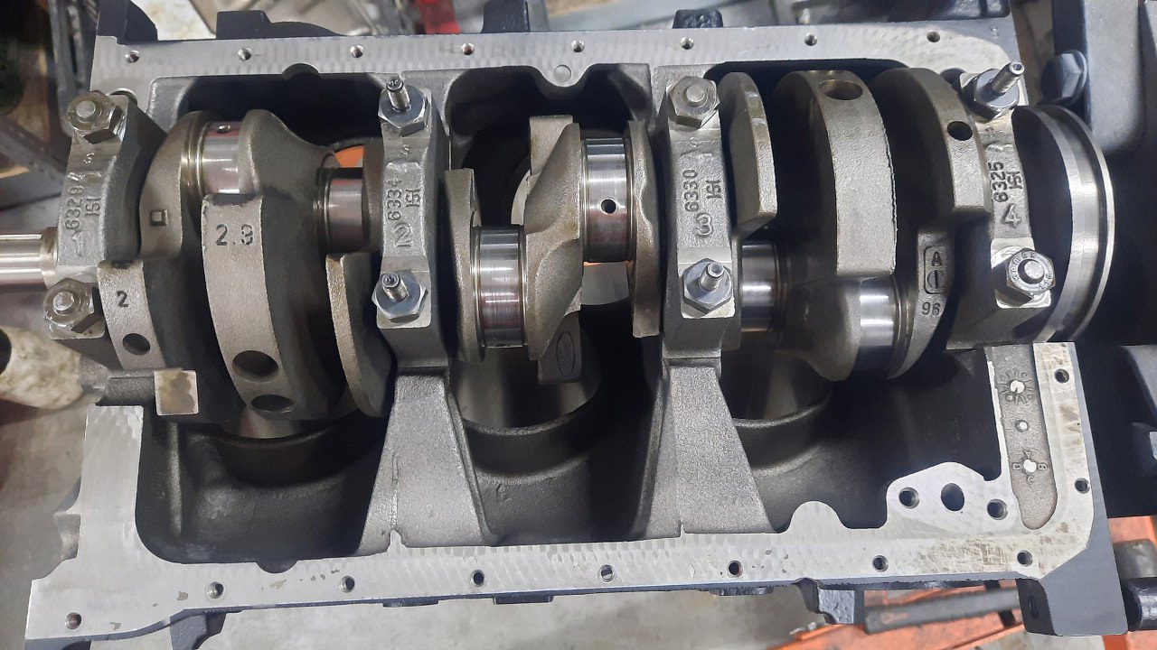 Włożyłem na miejsce wał korbowy i dokręciłem stopy wału. Nie jestem pewien, czy wał nie jest taki sam w wersji 12 i 24 zaworowej. Po prawej stronie widać datownik na odlewie - 96, czyli rocznik 96. To już jest wersja po drobnych zmianach, które weszły właśnie w 96 roku. Czyli to jest ten wzmocniony! :)