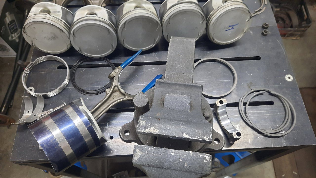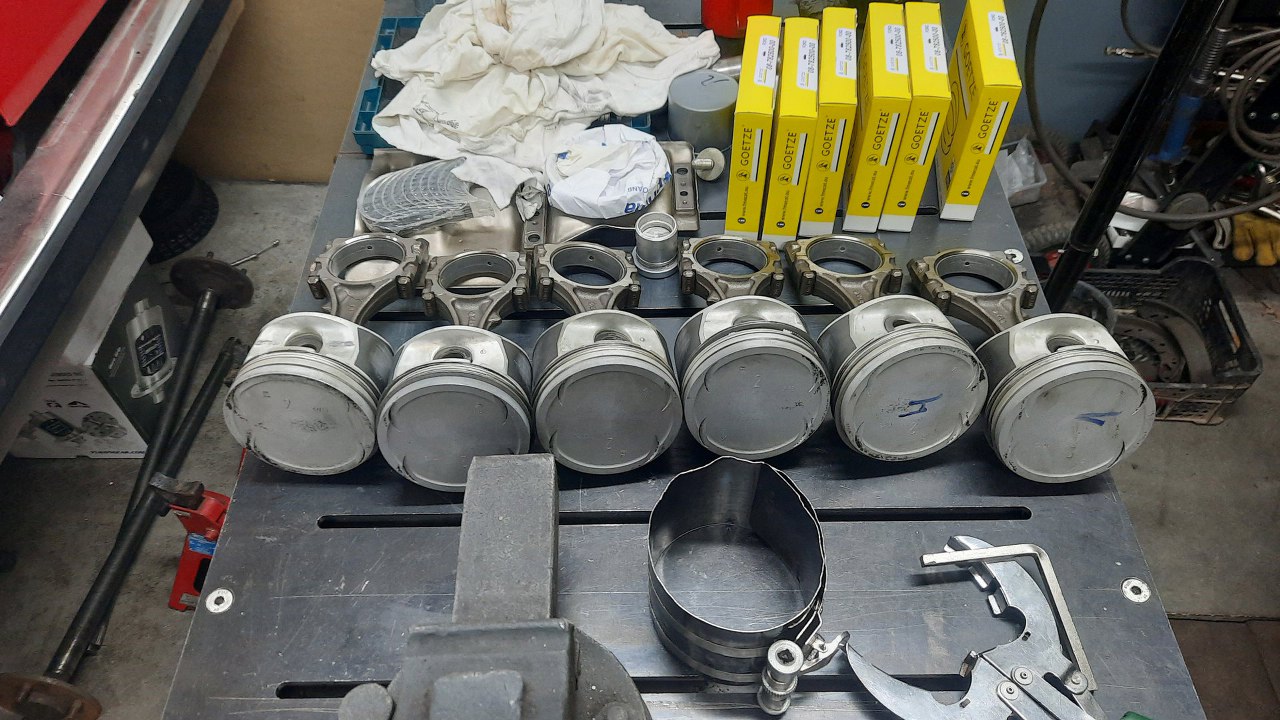 Dokładnie domyte zostały wszystkie tłoki. Zazwyczaj mają oznaczone korbowody cyframi oznaczającymi numer cylindra - tu tego nie ma. Korbowód i stopka korbowodu mają ten sam numer, bo są nierozłączną parą (nie pasują między sobą stopki i korbowody z innymi numerami). Na szczęście jakoś się połapałem skąd który tłok był i trafią na to samo miejsce. Kupiłem do nich nowe panewki korbowe i pierścienie. Jest niestety błąd w katalogach, i komplet pierścieni do tego silnika ma dobre pierścienie kompresyjne, ale za niski pierścień olejowy. Te pierścienie musiałem zamówić oddzielnie.