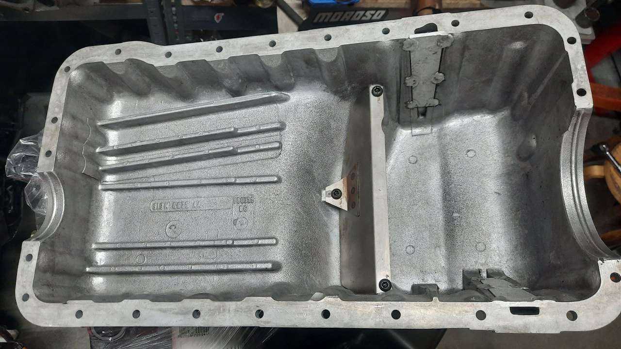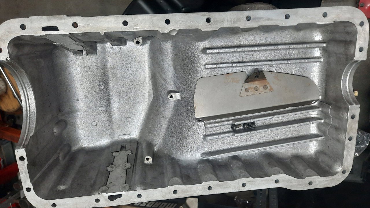 Mimo, że na razie nie mogę jeszcze przykręcić miski olejowej, to ją dokładnie doczyściłem, łącznie z blaszką grodziową. W misce po obu jej stronach widać pionowe kanały - to są spływy oleju z głowic, poprowadzone na dno miski.
