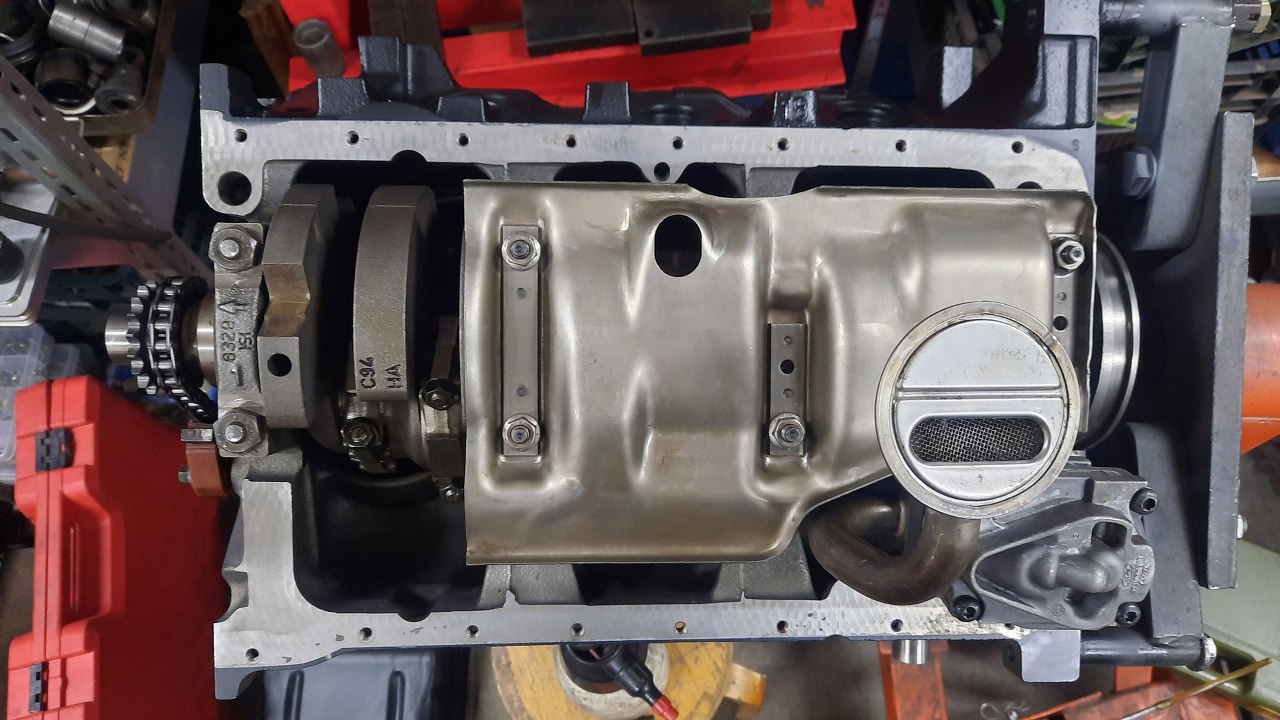 Jak już nie potrzebuję się dostawać do śrub korbowodu, to mogłem przykręcić blachę na stopy wału.