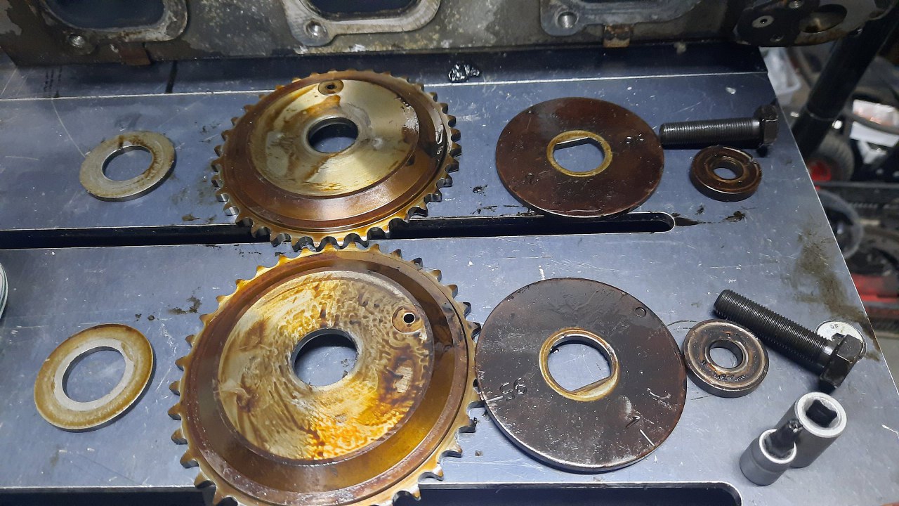 Każdy z wałków ma za to swój talerzyk z odpowiednim numerem Talerzyk wewnątrz ma płaski fragment pasujący do wałka, a na obwodzie pin ustalający, który trafia w otworek w kole zębatym. To właśnie ustala rozrząd w tym silniku.
