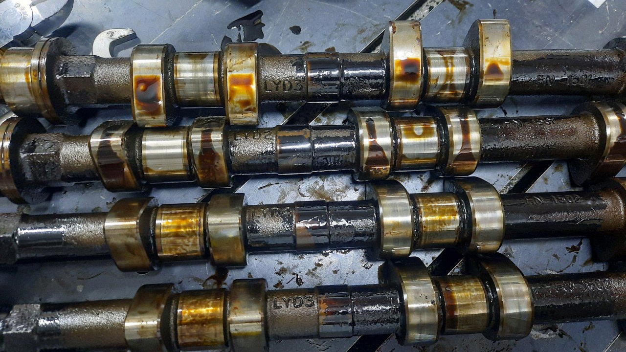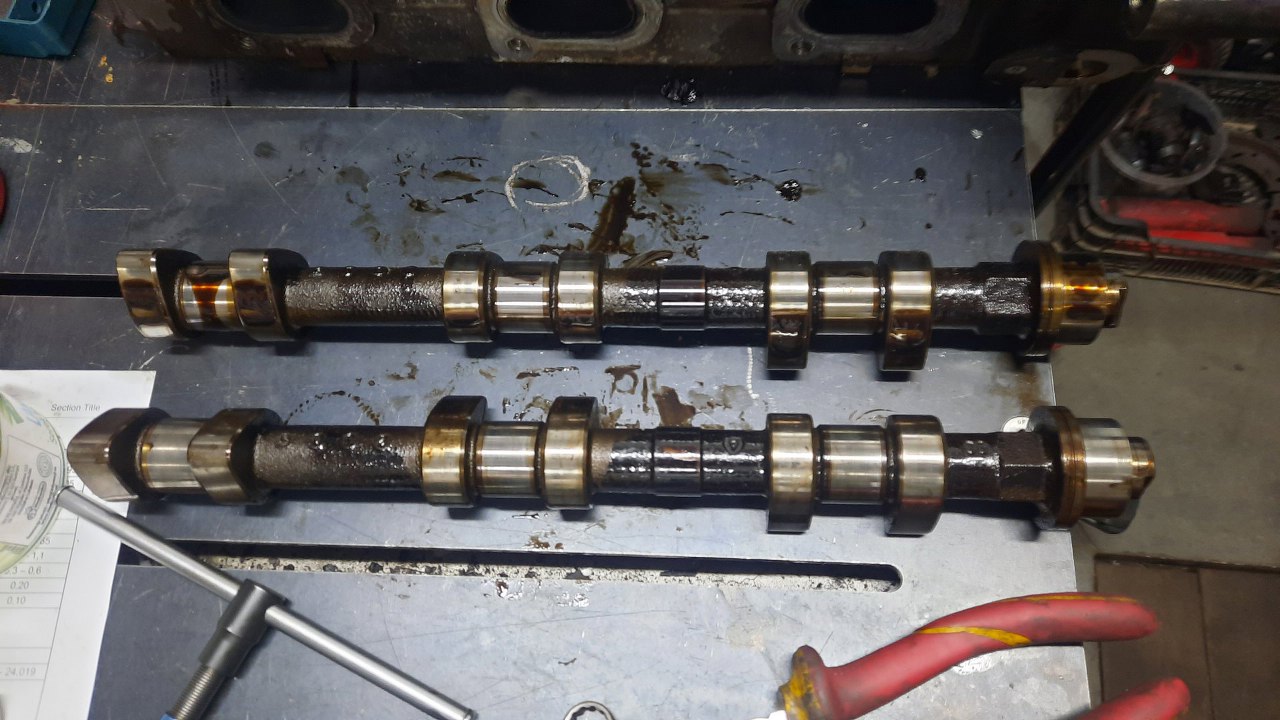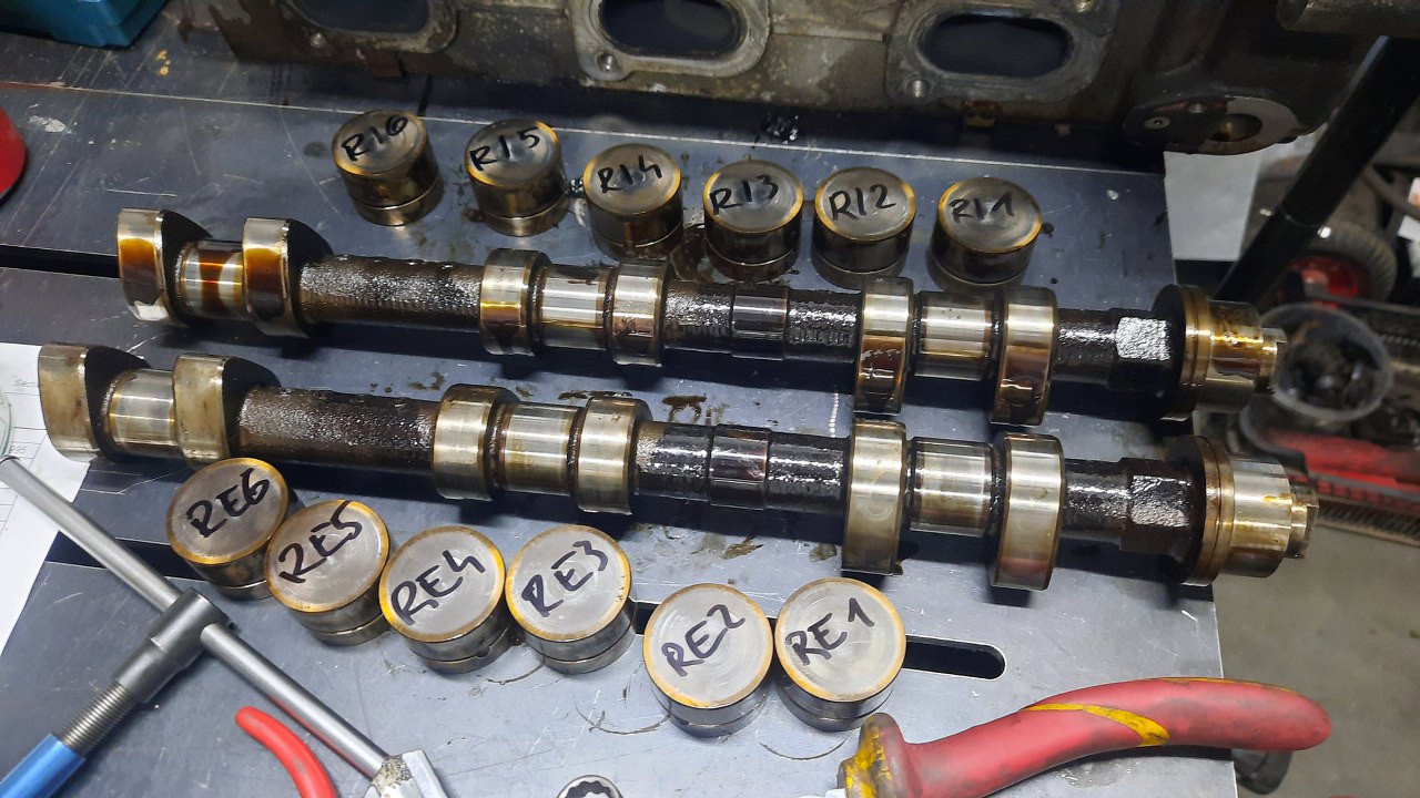 Wałki rozrządu już luzem. Wyglądają na nowe, więc jest nieźle. Mają prawie wszyskie oznaczenia takie same, różnią się tylko jednym, ale fizycznie nie różnią się niczym - krzywki i wycięcia na koła zębate są w tym samym miejscu, więc sądzę, że są zamienne. Oczywiście tylko między sobą, bo w drugiej głowicy są dłuższe wałki.