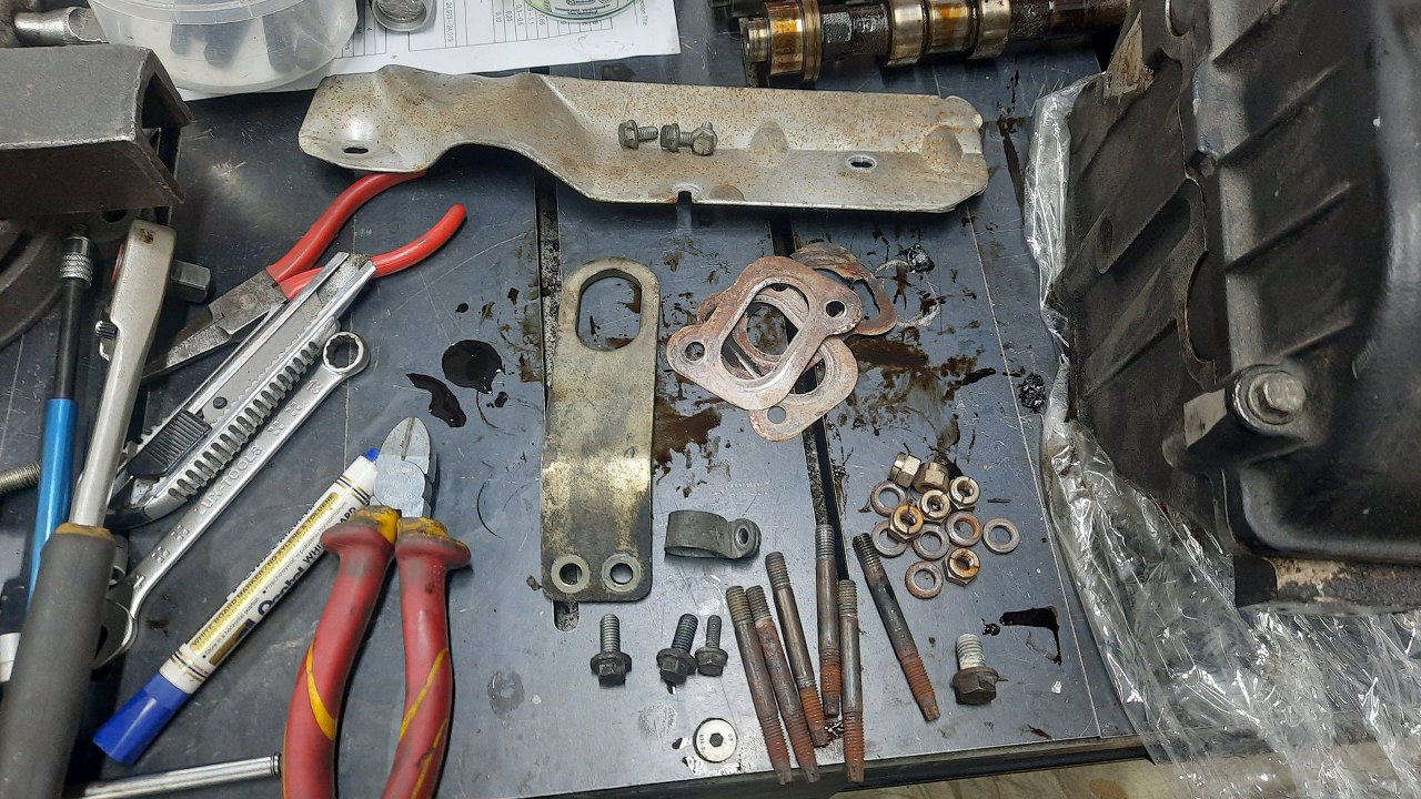 Tak wygląda po odkręceniu. Co ciekawe - w zestawie uszczelek nie ma żadnej uszczelki pod napinacz i pod kolanko spływu oleju do miski olejowej.