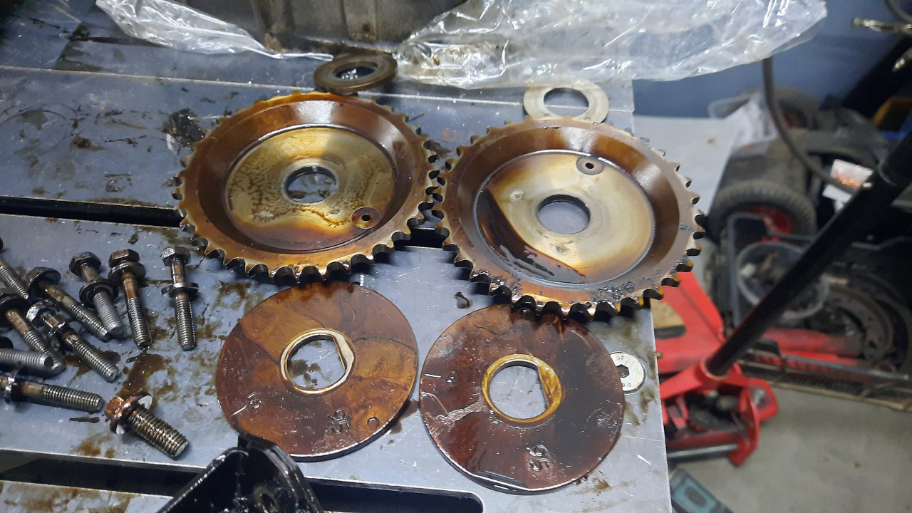 Odkręciłem górny ślizg. Kółka zębate są takie same w obu głowicach, tylko są w nich odwrotnie przykręcone Te mają wypukłą stronę d zewnątrz, żeby zęby były w linii łańcucha bliższego bloku.